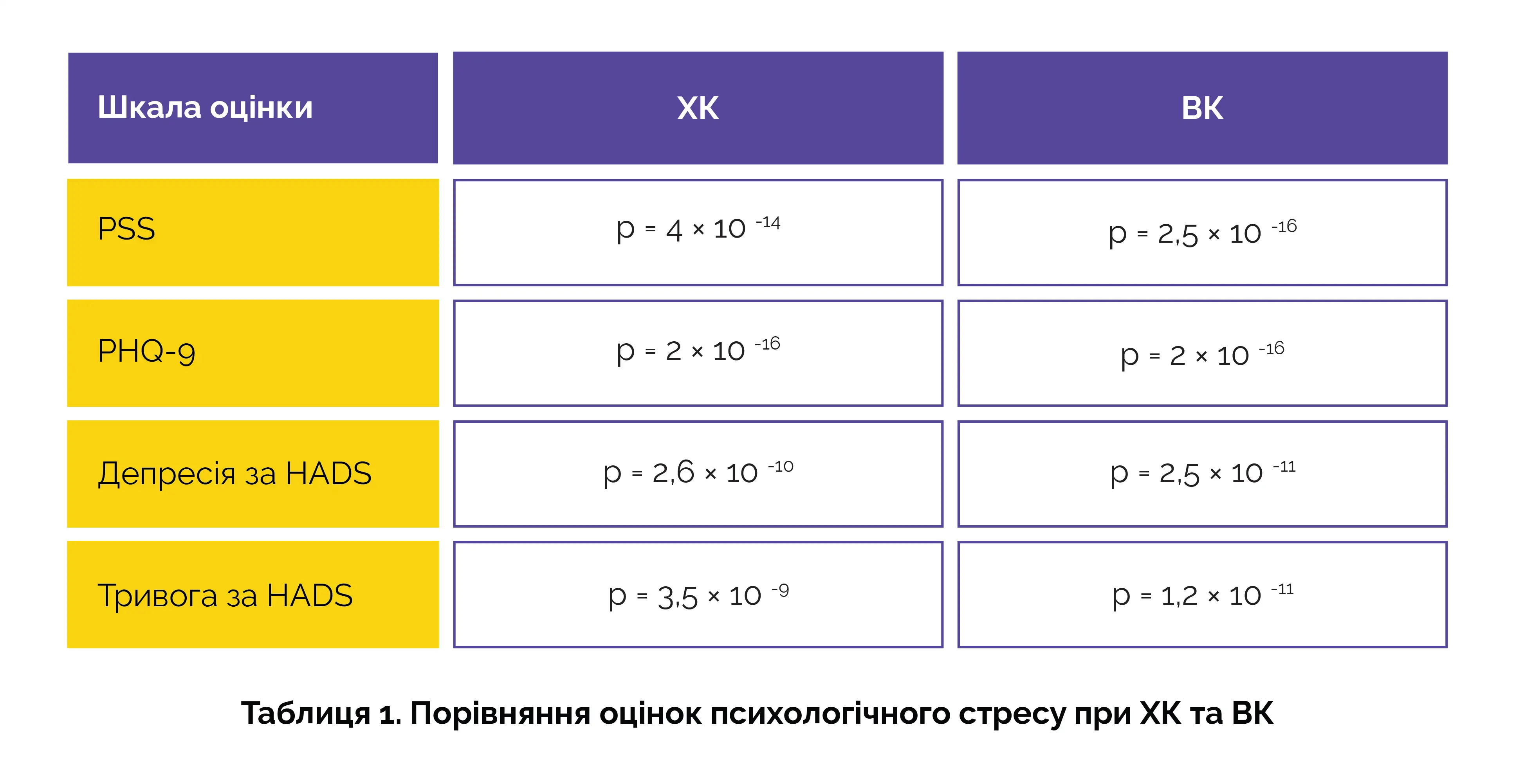 Дослідники оцінили стрес, тривогу та депресію у 50 пацієнтів з ХК, 54 пацієнтів з ВК та 100 учасників контрольної групи без ЗЗК. Для оцінки використовували опитувальники: опитувальник здоров'я пацієнта (PHQ-9), шкала стресу, що сприймається пацієнтом (PSS), і госпітальна шкала тривоги і депресії (HADS). Було проведено аналіз зв'язку між психологічними оцінками та експресією генів IL-17A, IL-17F та IL-23A у слизовій оболонці кишечника пацієнтів із ЗЗК. У пацієнтів з ХК та ВК спостерігалися значно вищі оцінки порівняно з учасниками контрольної групи (див. таблицю 1 нижче).