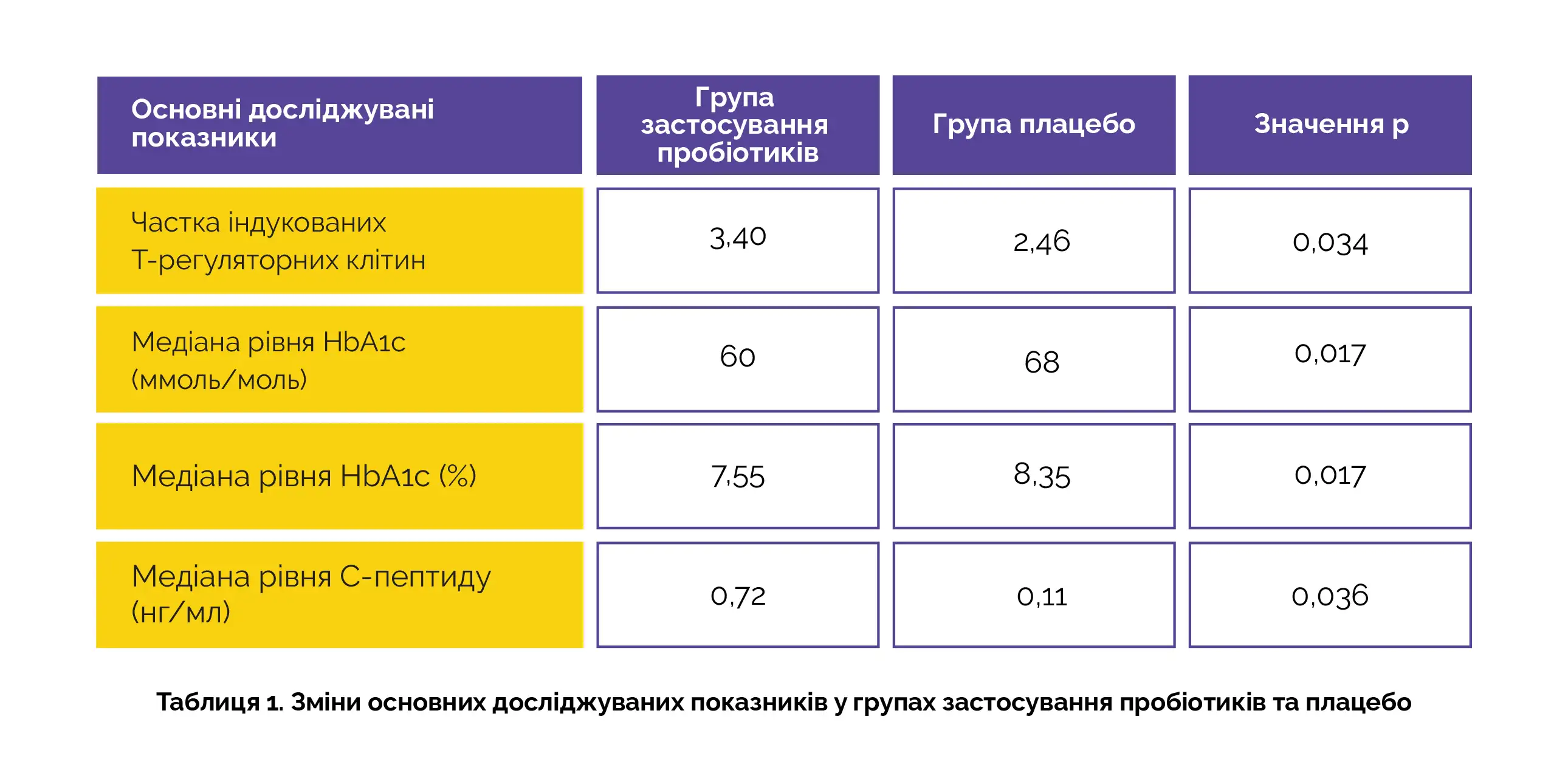 Дослідження завершили 23 дитини у групі плацебо та 27 дітей у групі застосування пробіотиків. У групі застосування пребіотиків частка індукованих Т-регуляторних клітин суттєво збільшилася порівняно з групою плацебо. У групі плацебо рівні HbA1c були статистично значуще нижчими порівняно з групою застосування пробіотиків. У групі застосування пробіотиків медіана рівня С-пептиду була статистично значуще вище (див. таблицю 1).