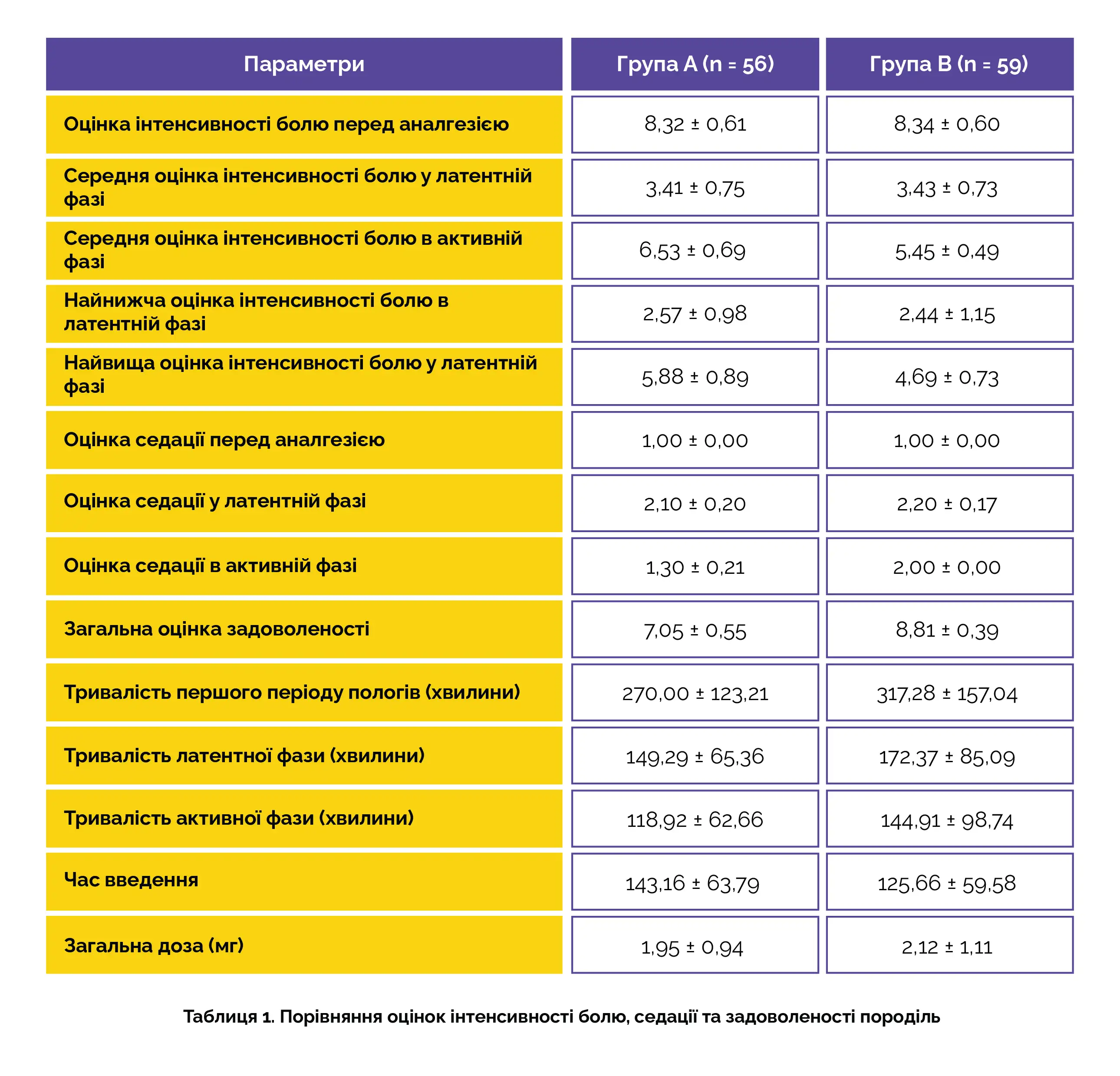 Згідно з результатами дослідження, помітні відмінності між двома групами в середніх оцінках інтенсивності болю за ЧРШ до аналгезії та під час латентної фази були відсутні.