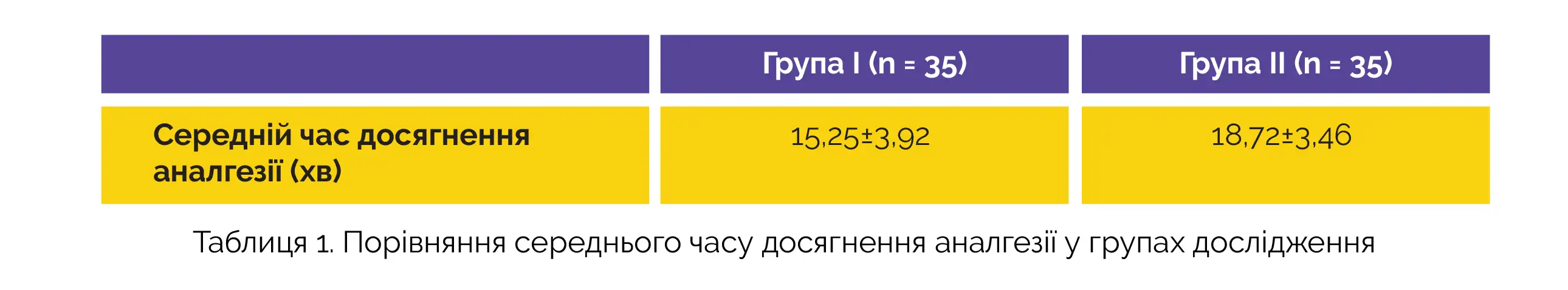 В обох групах було відзначено порівнянне зменшення значень показників гемодинаміки (середній артеріальний тиск, діастолічний та систолічний артеріальний тиск) відносно вихідного рівня, без наявності будь-яких статистично значущих відмінностей. У групі II статистично значно нижче були загальний обсяг застосування лікарських засобів і кількість доз з болюсним введенням препарату для усунення «проривного» болю. В обох групах було досягнуто максимального рівня аналгезії (оцінка за ВАШ ≤3 бали) через 20 хвилин після введення навантажувальної дози, однак у групі I досягнення аналгезії відбулося дещо швидше (див. таблицю 1).