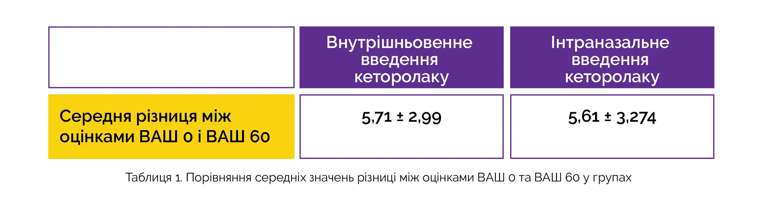 Рандомізацію пройшов 171 пацієнт: 86 були розподілені до групи внутрішньовенного введення кеторолаку, 85 – до групи інтраназального введення кеторолаку. Групи були зіставні за початковим рівнем інтенсивності болю, наявністю обструкції, викликаної камінням, розмірами та локалізаціями каменів та вихідними характеристикам пацієнтів. Дані про середню різницю між оцінками ВАШ 0 і ВАШ 60 при внутрішньовенному та інтраназальному введенні кеторолаку представлені в таблиці 1.