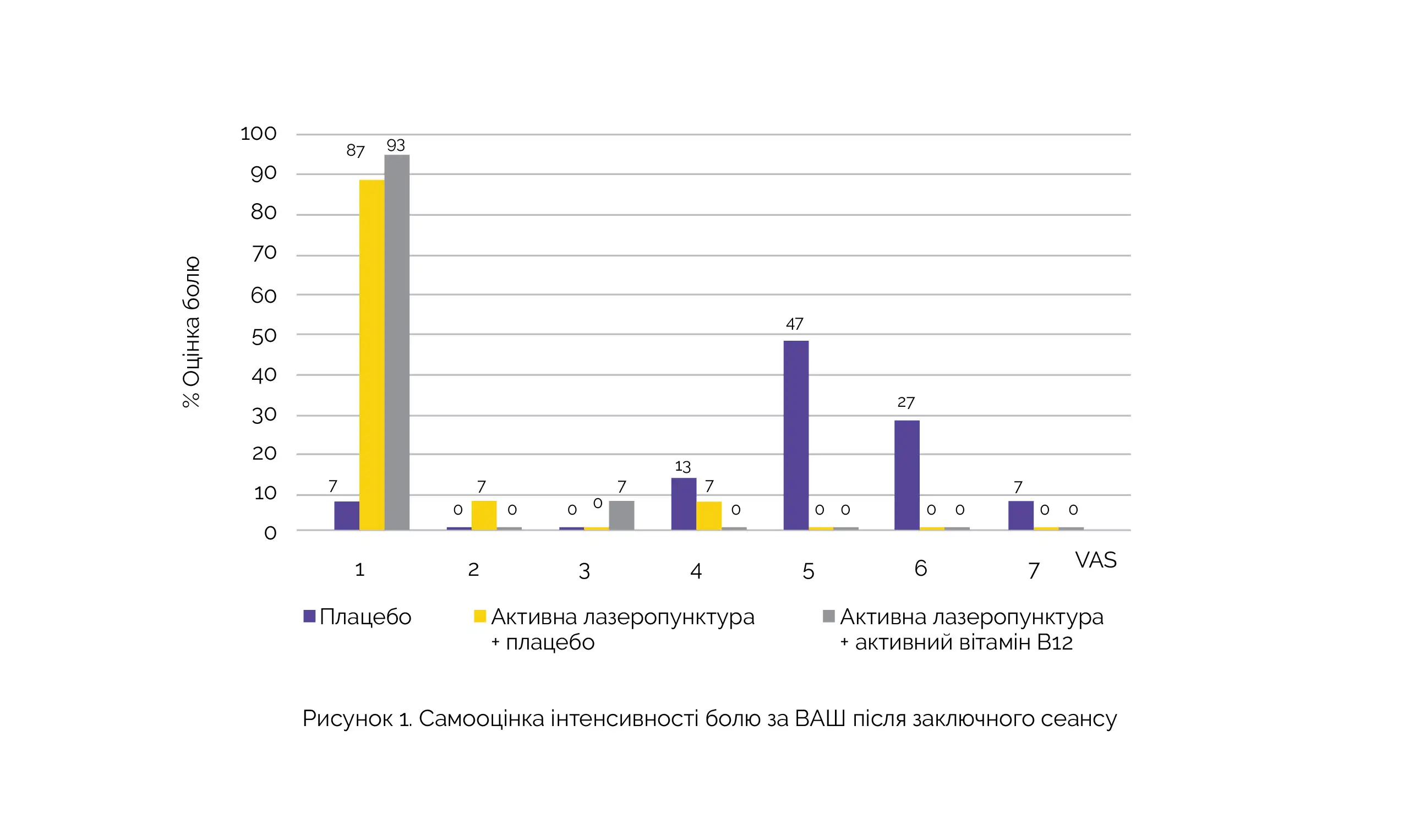 Інтенсивність болю оцінювали з використанням візуальної аналогової шкали (ВАШ) до та після проведення лазерної терапії на кожному сеансі. При проведенні лазеропунктури впливали на певні біологічно активні точки, стимуляція яких, згідно з традиційною китайською медициною, ефективна при лікуванні ДСНЩС. Для цього використовували лазерний пристрій, що генерує інфрачервоне випромінювання з енергією 3 Дж. Курс лікування включав 8 сеансів (по 2 сеанси на тиждень протягом 4 тижнів). Після втручання у групах 2 та 3 спостерігалося зниження інтенсивності болю, при цьому у пацієнтів у групі 3 відзначалося статистично значуще більш виразне поліпшення вже через 4 сеанси (див. рисунок 1).