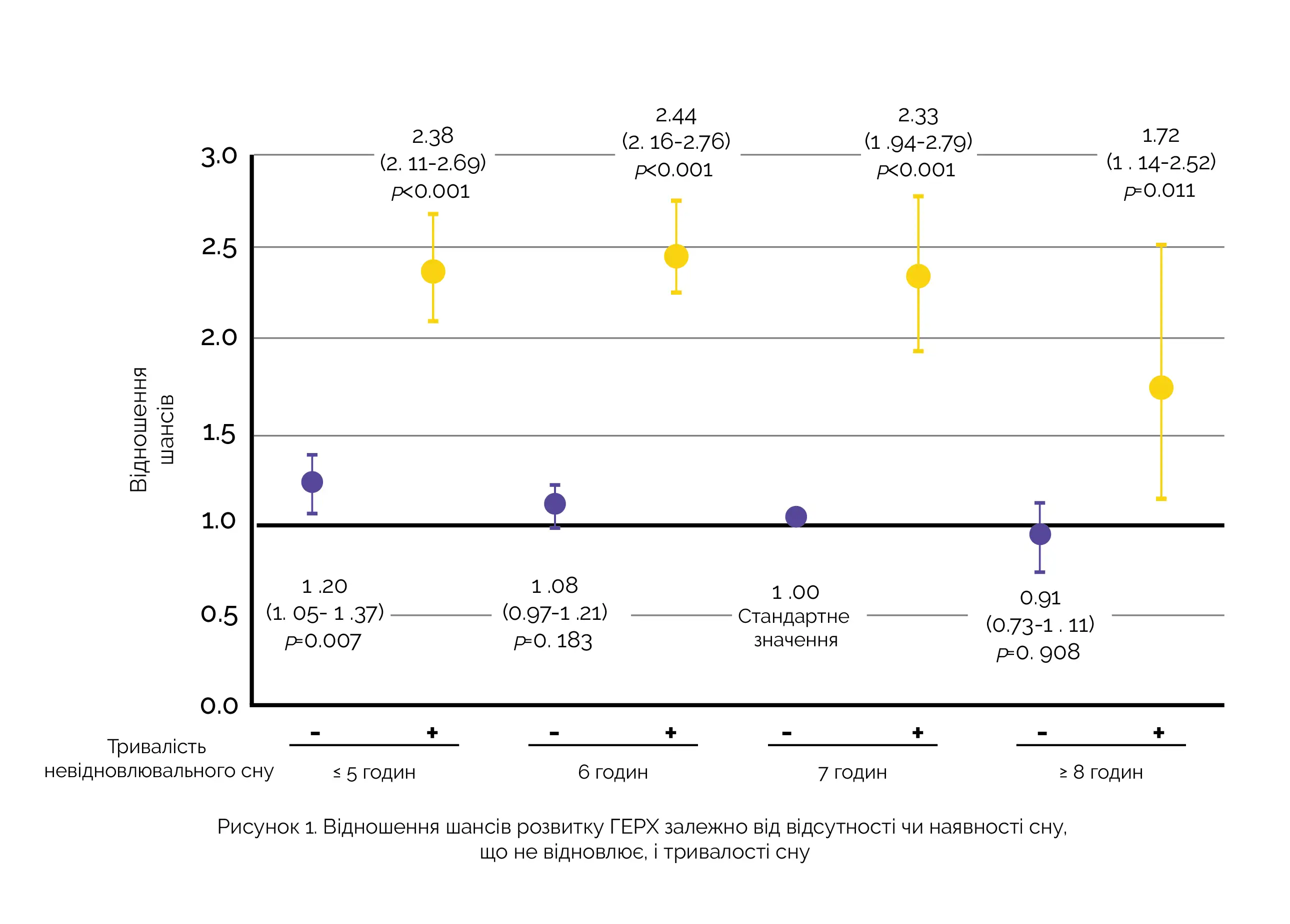 Поєднання невідновлювального сну та різної тривалості сну (≤ 5, 6, 7 або ≥ 8 годин) було незалежно пов'язане з підвищеним ризиком розвитку печії в порівнянні з особами без невідновлювального сну з тривалістю сну 7 годин (що використовується як стандартне значення). Значення відношення шансів (ВШ) для цього порівняння склали 2,38, 2,44, 2,33 та 1,72 відповідно (рисунок 1).