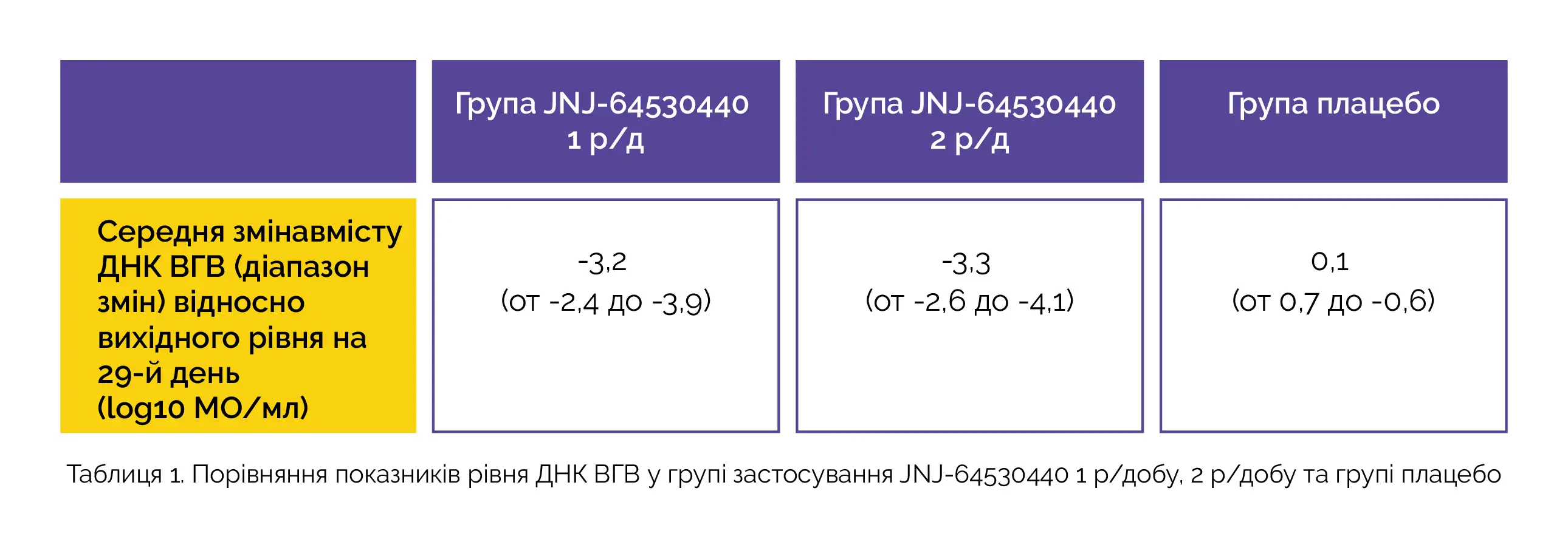 Значення РНК ВГВ «не виявлено» було відзначено у 3 з 7 пацієнтів у групі терапії 2 р/добу та у 4 пацієнтів з 6 у групі терапії 1 р/добу. У пацієнтів з ХГВ та здорових добровольців показники фармакокінетики JNJ-64530440 були порівнянні. Таким чином, згідно з отриманими даними, JNJ-64530440 впливає на формування капсиду, знижує вивільнення частинок, що містять РНК ВГВ, і тому може бути ефективним при застосуванні у пацієнтів із ХГВ.