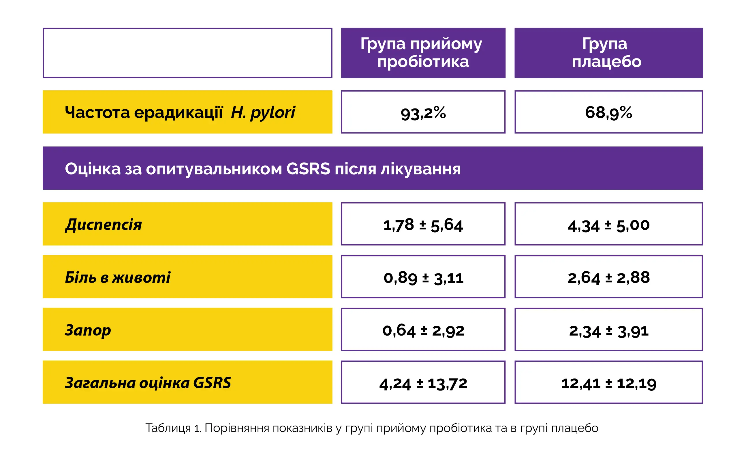 До дослідження було включено 90 пацієнтів, які відповідали критеріям відбору, при цьому один пацієнт достроково вибув із дослідження (38 чоловіків, 51 жінка, медіана віку: 52 роки). Загалом 45 пацієнтам (50,6 %) було призначено плацебо та 44 пацієнтам (49,4 %) – пробіотик. У таблиці 1 наведено дані про частоту ерадикації H. pylori у групі прийому пробіотика та групі плацебо. У групі прийому пробіотика після завершення лікування було виявлено статистично значуще зниження оцінок виразності диспепсії, запору та болю в животі за опитувальником GSRS, а також загальної оцінки за опитувальником GSRS.