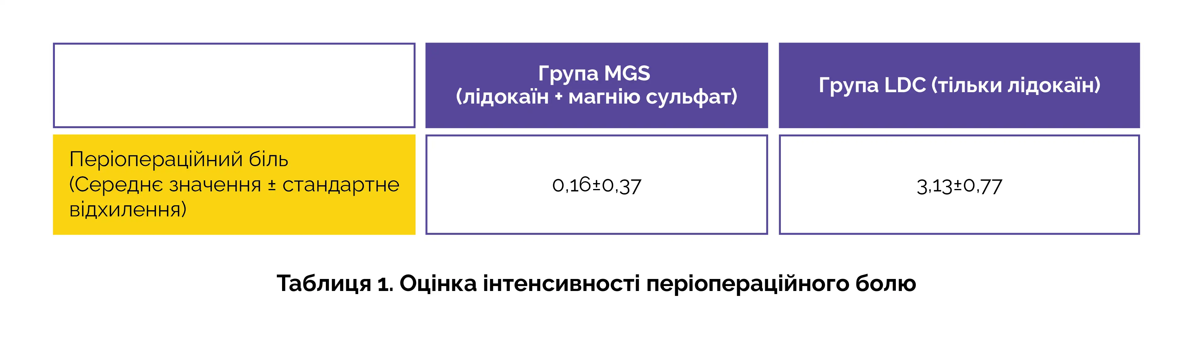 Передопераційну та періопераційну інтенсивність болю оцінювали з використанням візуальної аналогової шкали (ВАШ). У групі MGS спостерігалася вища частота успішної БНАН. Середня оцінка інтенсивності періопераційного болю була значно нижчою у групі MGS порівняно з групою LDC (див. таблицю 1).