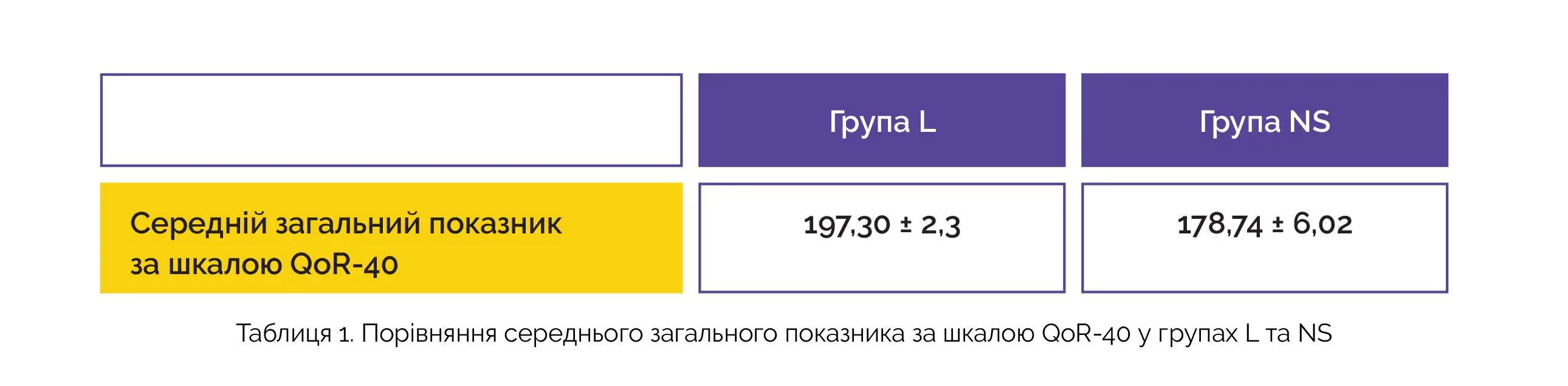 Демографічні характеристики пацієнток були зіставні в обох групах. У таблиці 1 наведено порівняння середнього загального показника за шкалою QoR-40 групи L та у групі NS.