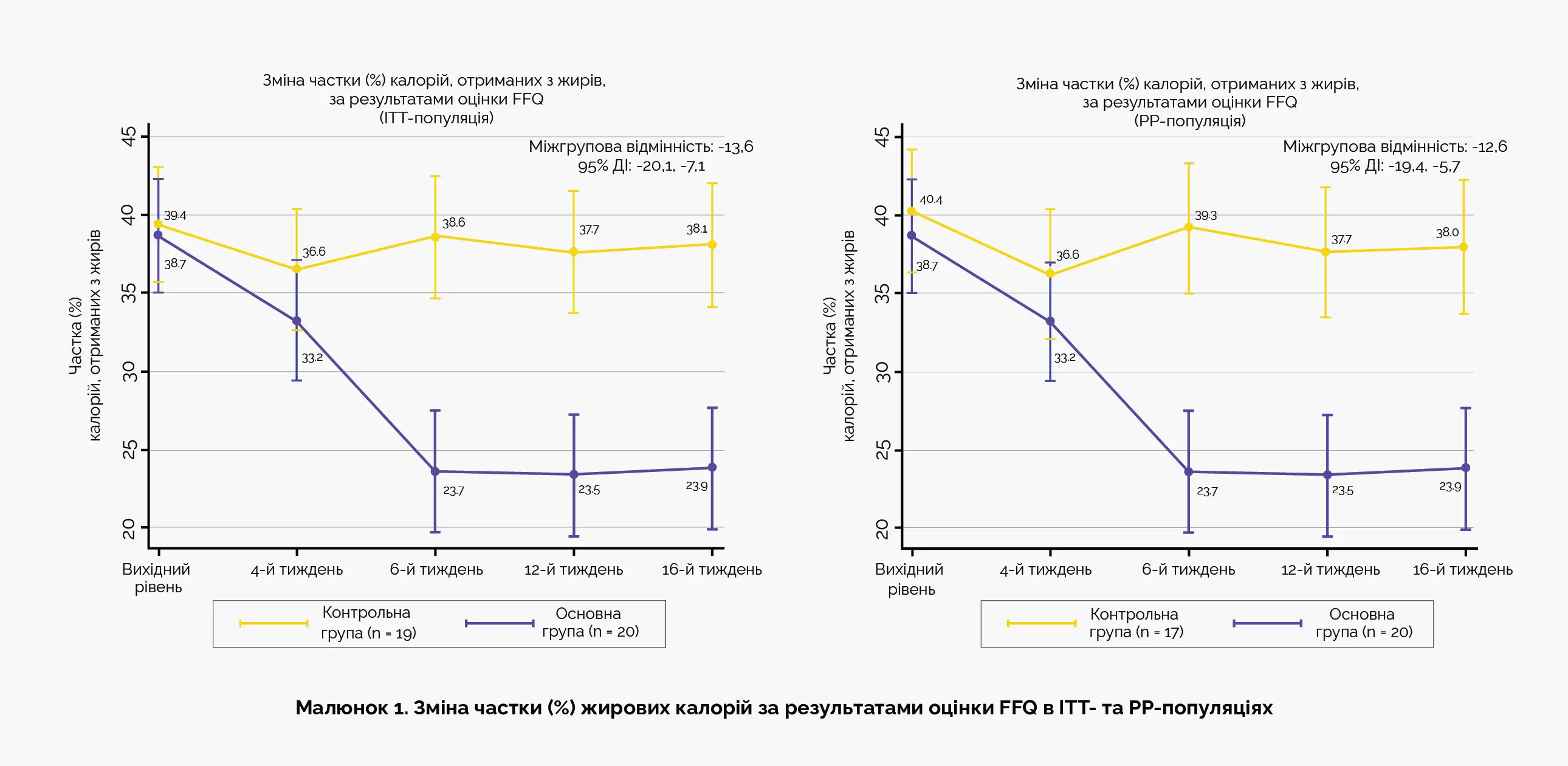 В основній групі спостерігалося статистично значуще зниження середньої кількості калорій, отриманих з жирів, з 39% на початковому рівні до 24% наприкінці дослідження, при цьому 45% учасників досягли частки калорій, отриманих із жирів, <25% та 25% учасників – частки калорій, отриманих із жирів, <20 %. У контрольній групі, навпаки, відзначалася менша прихильність: лише 5,3 % учасників досягли частки калорій, отриманих із жирів, <25 %, а частки калорій, отриманих із жирів, <20 % –5,3 % учасників. В основній групі середня кількість калорій, отриманих з жирів, знизилася на 15%, що статистично значуще більше зниження на 1%, що спостерігалося в контрольній групі (міжгрупова відмінність: -14). Це свідчить про високий рівень дотримання досліджуваної дієти (див. рисунок 1)
