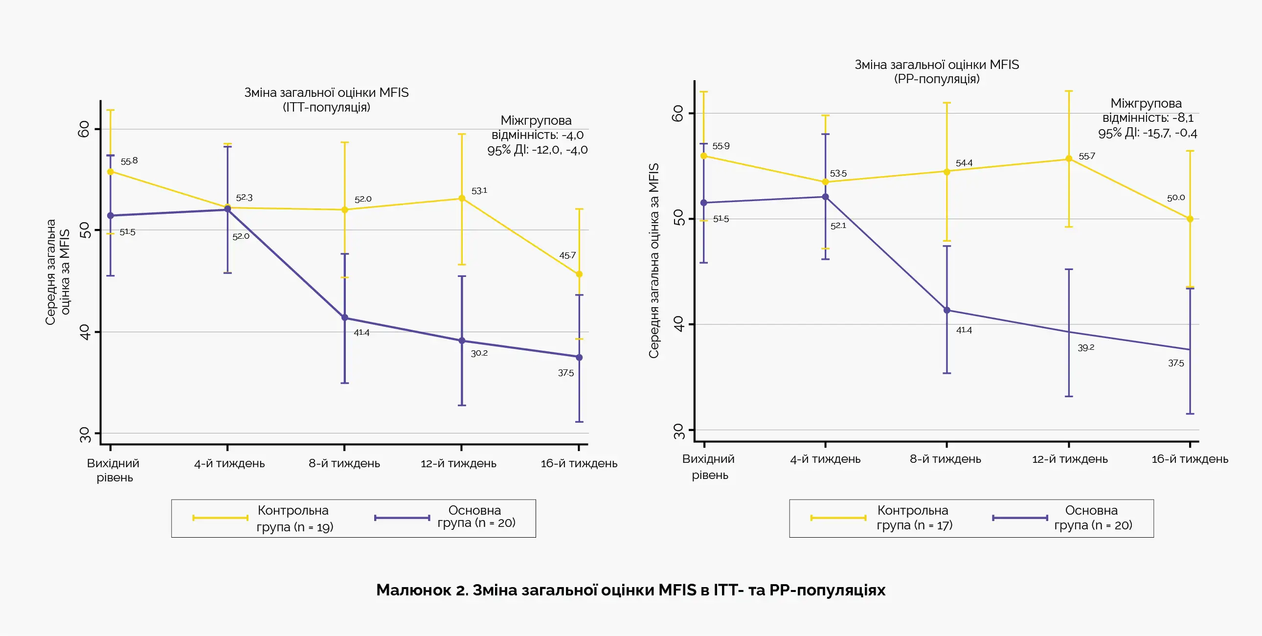 При аналізі в ITT-популяції в основній групі середнє зниження загальної оцінки з MFIS склало 14 балів, а в контрольній групі - 10 балів. Середня міжгрупова відмінність знизилася на 4 бали. Аналогічно цим даними результати аналізу в РР-популяції свідчили про зниження середньої міжгрупової різниці на 8 балів, а результати аналізу чутливості вказували на подальше зниження на 14 балів, що додатково підтвердило отримані результати (малюнок 2).
