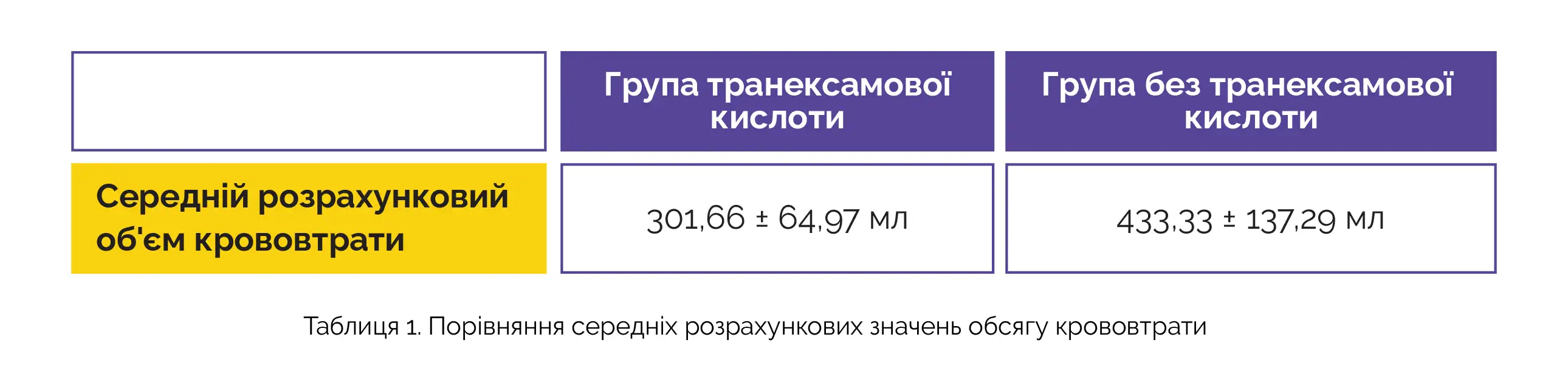 Пізніше (безпосередньо перед випискою) у пацієнток вимірювали об'єм крововтрати, виходячи з концентрації гемоглобіну та гематокриту на другий день після операції. У ході дослідження було отримано вражаючі результати. У групі застосування транексамової кислоти середній розрахунковий обсяг крововтрати був меншим, ніж у групі без застосування транексамової кислоти (таблиця 1).
