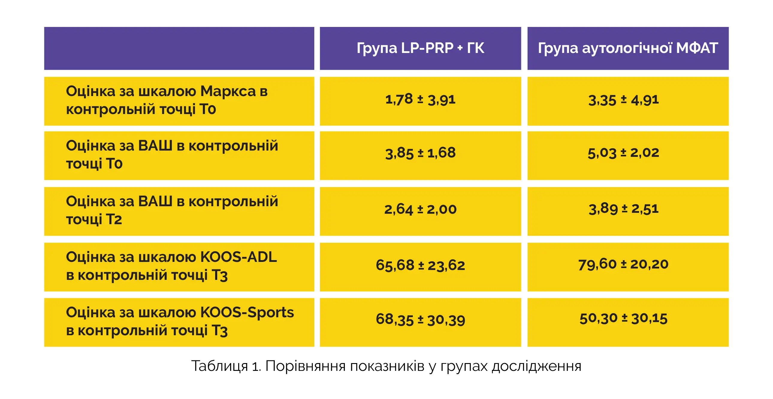 Що стосується функціонального покращення в різні контрольні моменти часу, статистично значущих відмінностей між групами введення аутологічної МФАТ та трьох ін'єкцій LP-PRP у поєднанні з ГК виявлено не було. Обидва варіанти лікування були безпечними та не призводили до розвитку серйозних ускладнень. До середини періоду спостереження обидва варіанти лікування забезпечили покращення якості життя та функції колінного суглоба, а також зниження інтенсивності болю незалежно від статі та віку пацієнтів.