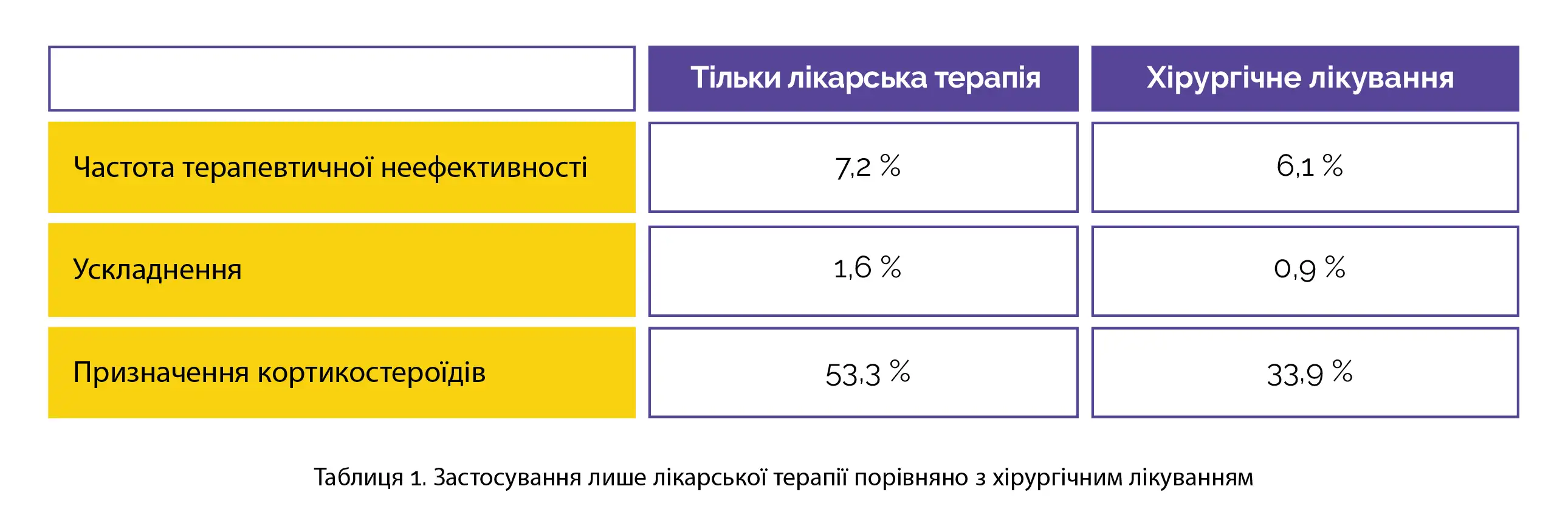 Міжгруповий аналіз включав порівняння стратегії контролю захворювання, демографічних даних, результатів лікування та клінічної картини. Основні кінцеві точки включали оцінку частоти терапевтичної неефективності, яка визначається як потреба в подальшому хірургічному втручанні, та оцінку частоти розвитку ускладнень протягом двох тижнів після терапії.