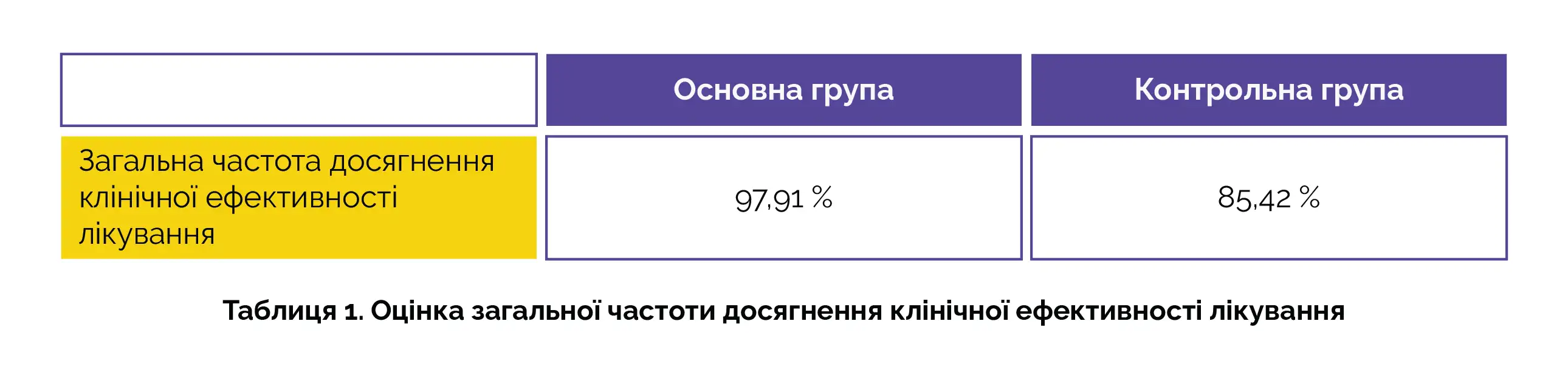 В результаті в основній групі, що отримувала комбіновану терапію, загальна частота досягнення клінічної ефективності лікування була значно вищою, ніж у контрольній групі (див. таблицю 1).