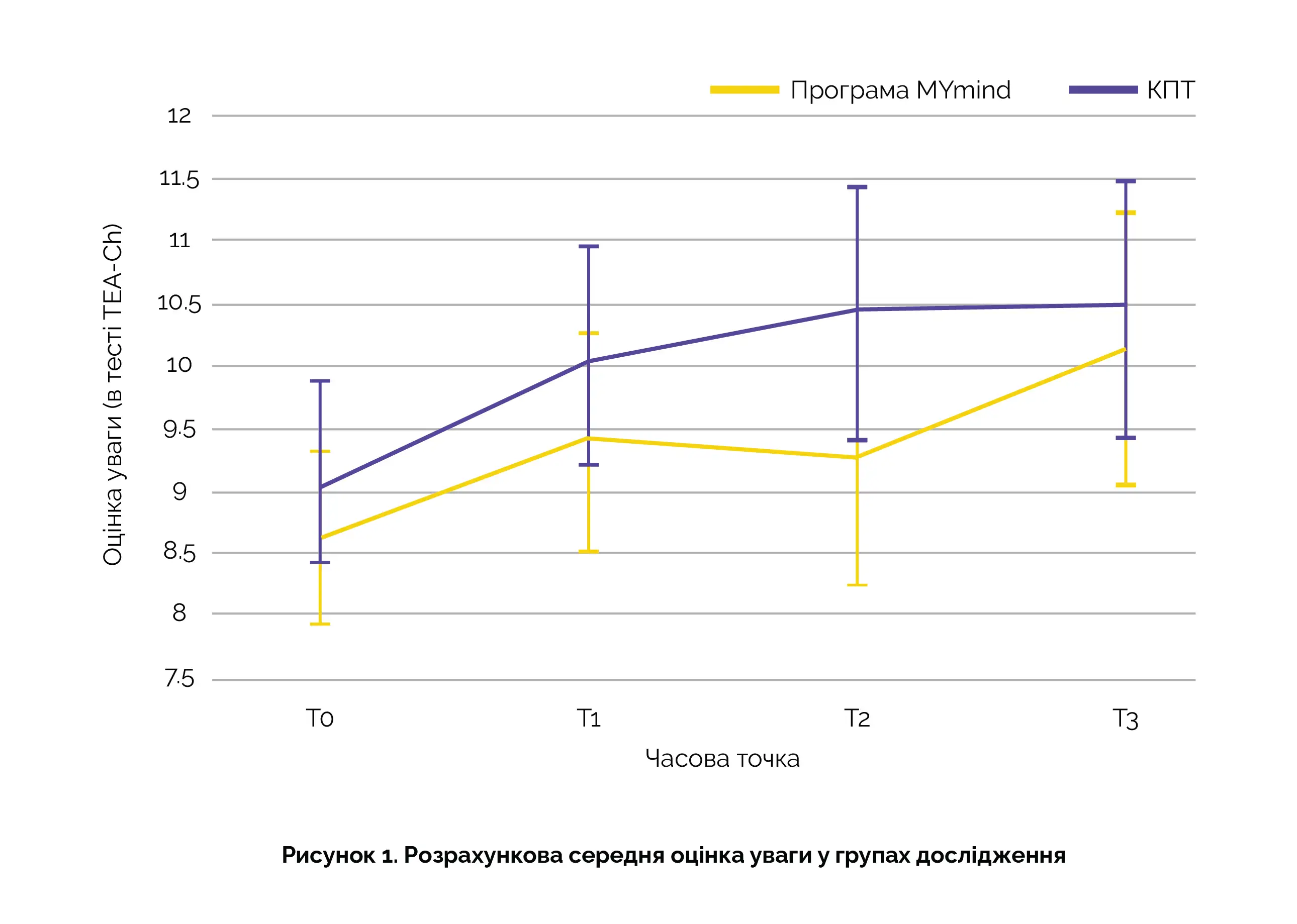 Оцінку в рамках дослідження виконували на початковому рівні (T0), безпосередньо після проведення втручань (T1) і в період наступного спостереження через три (T2) і шість місяців (T3). Основною кінцевою точкою була оцінка уваги з використанням завдання «Пошук у небі» (англ. Sky Search) із Дитячого тесту повсякденної уваги (TEA-Ch). Додатковими кінцевими точками були оцінки поведінки дитини та факторів, пов'язаних із батьками. Після проведення як програми Mymind, так і КПТ було виявлено статистично значуще покращення оцінки уваги у дітей через 6 місяців. Рівень бета групи проведення програми MYmind становив 1,48 (p = 0,013, d Коена = 0,32), а групі КПТ — 1,46 (p = 0,008, d = 0,27) (див. малюнок 1).