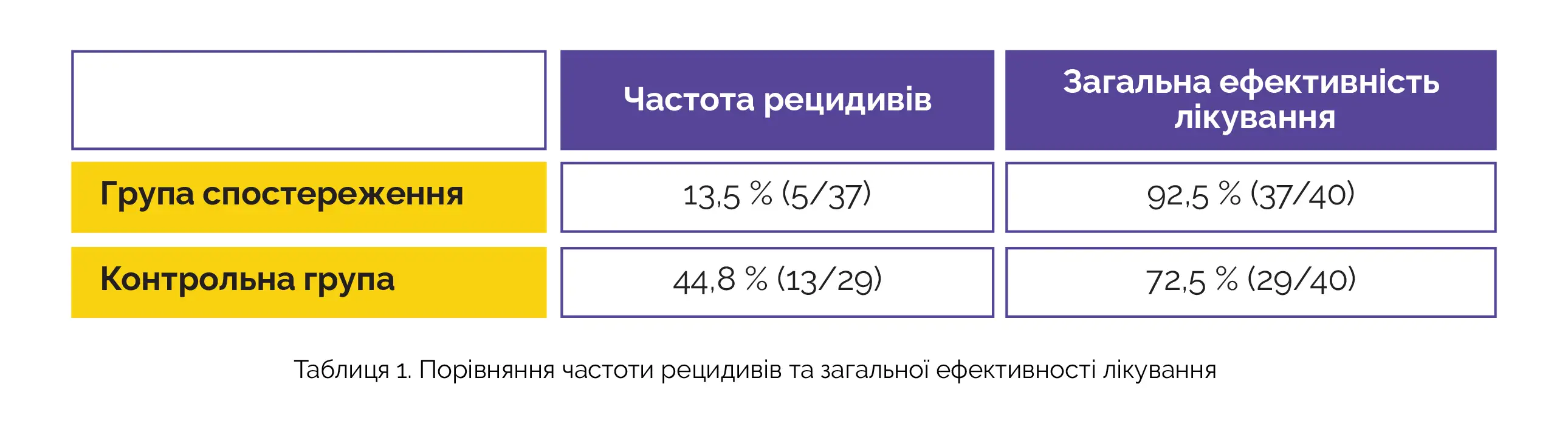 Слід зазначити, що у групі спостереження бал з ВАШ і бал RQLQ були нижчими, ніж у контрольній групі. Частота рецидивів у групі спостереження була статистично значно нижче, ніж у контрольної групі. Крім того, у групі спостереження загальна ефективність лікування була вищою, ніж у контрольній групі (таблиця 1).