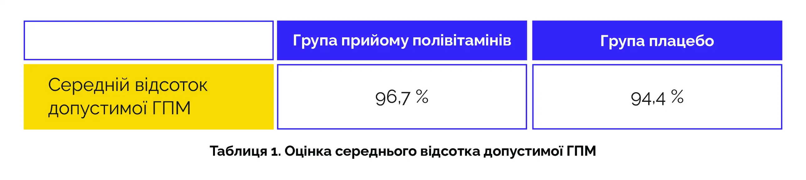 Крім того, бінарні результати оцінювалися за допомогою логбіноміальних моделей. Результати дослідження показали, що у вагітних жінок, які отримували полівітамінні комплекси, спостерігалося покращення показників ГПМ порівняно з тими, хто отримував плацебо, як показано в таблиці 1: