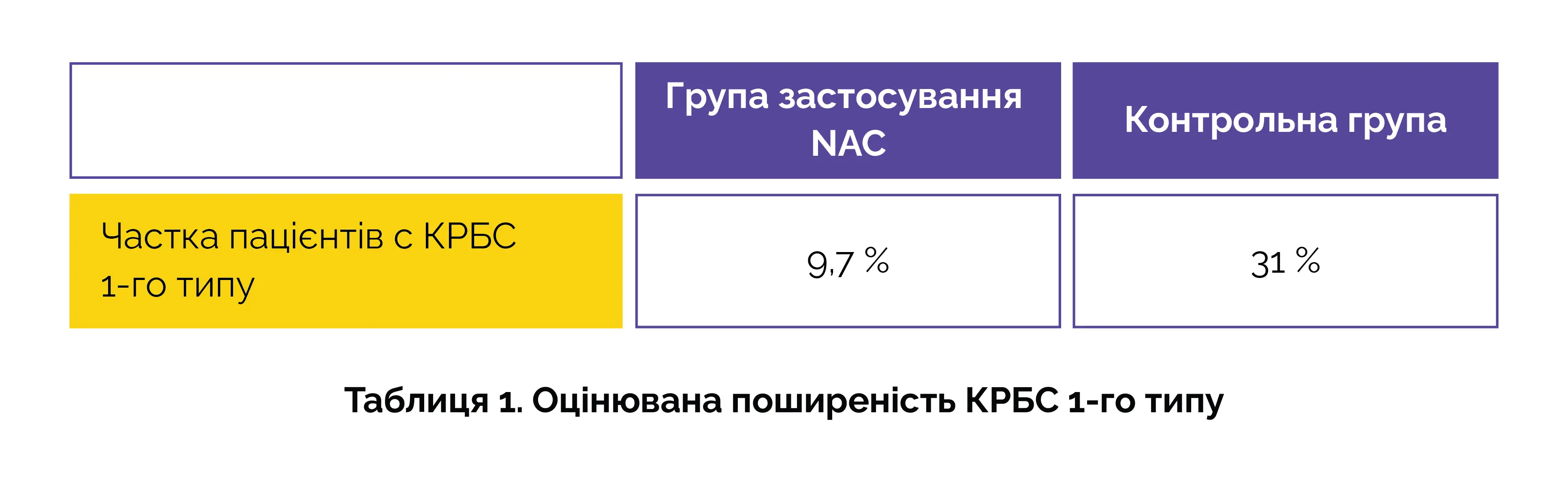 Результати показали виражену різницю між пацієнтами з КРБС 1-го типу і без нього. Пацієнти з КРБС 1-го типу мали значно вищі рівні прозапальних цитокінів (IL-6, FNA-α, IL-1) та підвищені рівні маркерів оксидативного стресу (загальний оксидантний статус та індекс окисного стресу) з нижчим загальним антиоксидантним статусом. У групі NAC частота КРБС 1-го типу була значно нижчою, ніж у контрольній групі (див. таблицю 1).