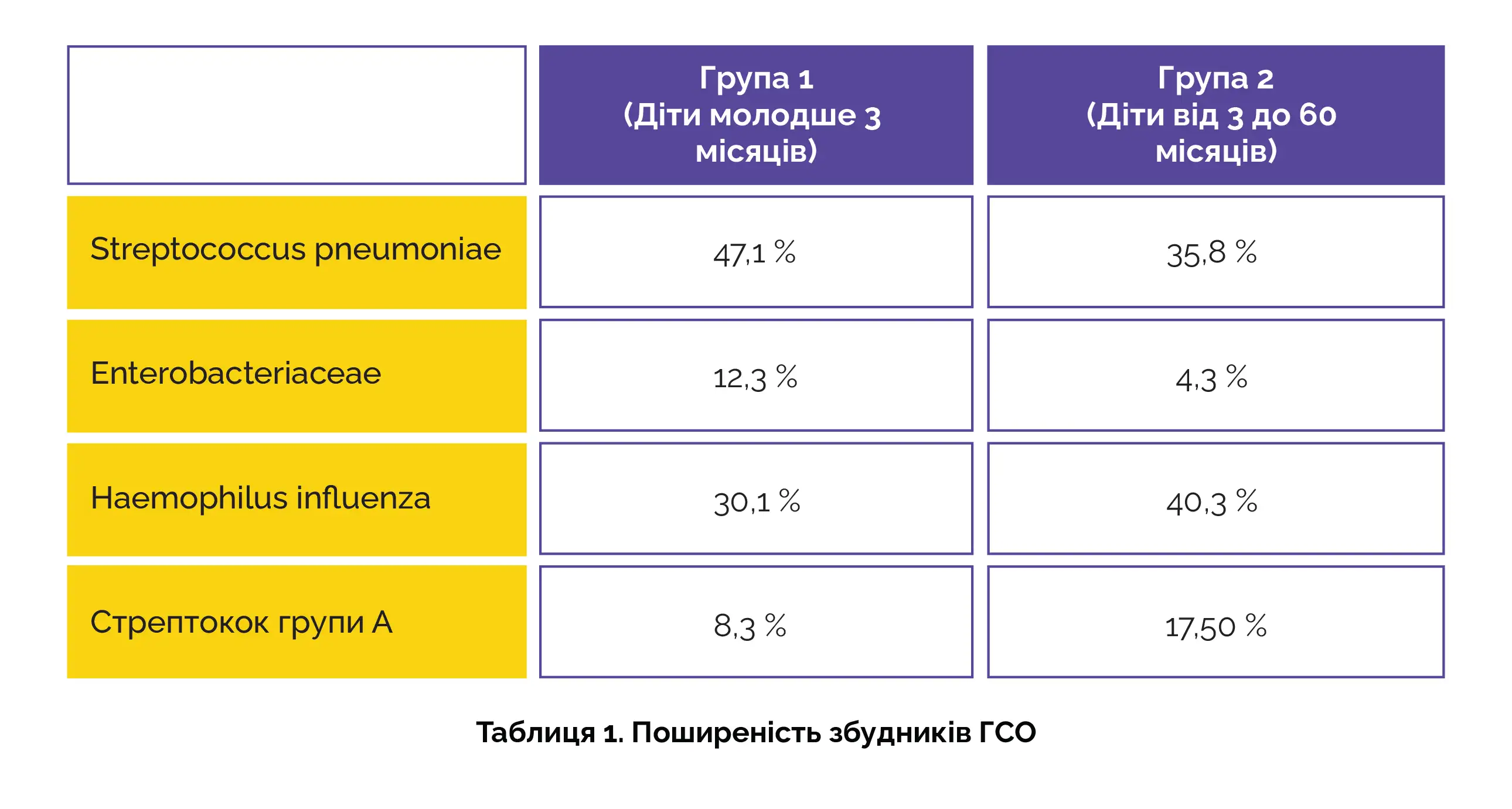 1. Відмінності у поширеності. У дослідженні було виявлено статистично значущу відмінність у поширеності основних патогенів між новонародженими (група 1) та дітьми старшого віку (група 2). У групі 1 поширеність Streptococcus pneumoniae та Enterobacteriaceae була вищою, ніж у групі 2. З іншого боку, у групі 2 була вищою поширеність Haemophilus influenza і стрептокока групи А (див. таблицю 1).