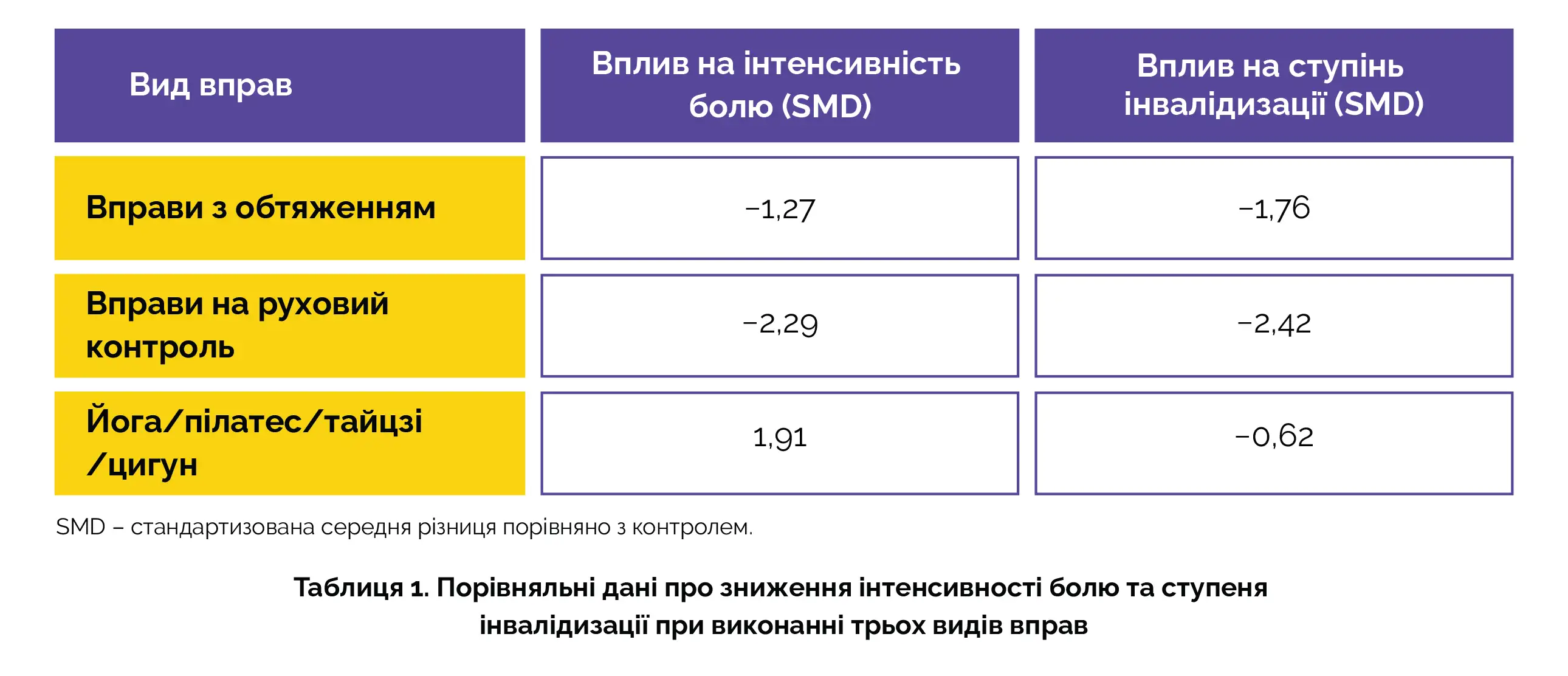 Крім того, був проведений аналіз методом метарегресії для встановлення залежності відповіді на терапію від дози з метою оцінки ефективності кожного виду вправ з використанням величини ефекту від різних втручань як залежної змінної та обсягу тренування та контрольної групи як незалежних змінних. Усього в аналіз було включено 68 досліджень. Встановлено, що вправи з обтяженням, вправи на руховий контроль та такі вправи, як йога/пілатес/тайцзі/цигун, забезпечують статистично значуще більш виражене зниження інтенсивності болю та ступеня інвалідизації порівняно з контролем (див. таблицю 1).