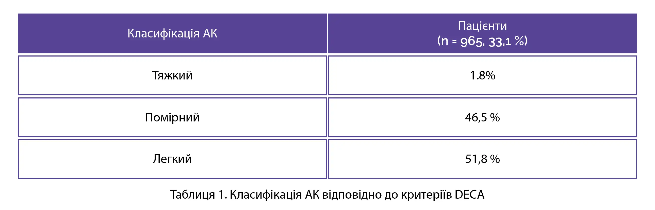 До дослідження було включено 2914 пацієнтів (віком від 1 до 90 років) з АК, що брали участь у дослідженні Alergológica (національне дослідження алергічних захворювань) у 2015 р. Оцінку демографічних даних, класифікацію на підставі критеріїв DECA, а також аналіз етіології та супутніх захворювань проводили за віковими групами (≤14 років та >14 років). Із загальної кількості пацієнтів у 965 пацієнтів (33,1%) було діагностовано АК (у 77,5% пацієнтів — віком старше 14 років). Класифікацію АК проводили виходячи з ступеня тяжкості захворювання (див. таблицю 1).