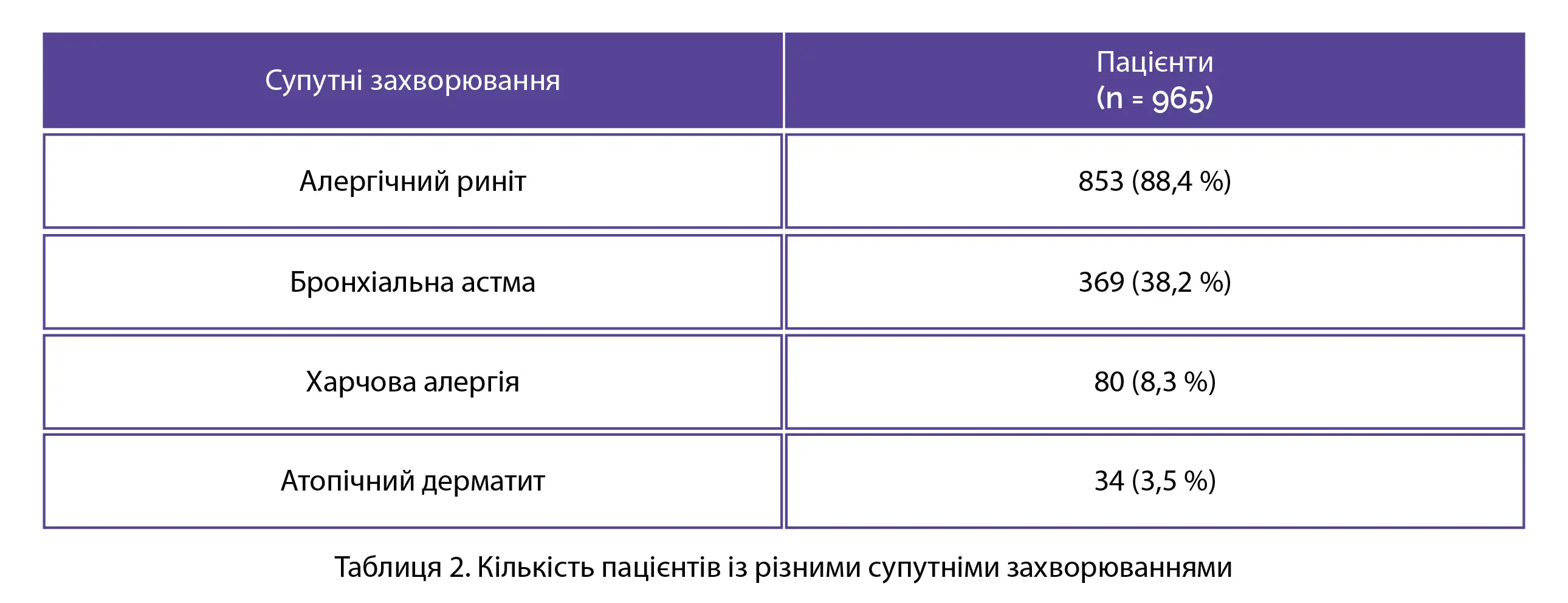 У 51,6% випадків АК був інтермітуючого типу, а в 48,4% - персистуючого типу. У 4% пацієнтів спостерігався лише АК. Алергічний кон'юнктивіт був пов'язаний з ринітом, за яким слідували астма, харчова алергія і атопічний дерматит (див. таблицю 2).