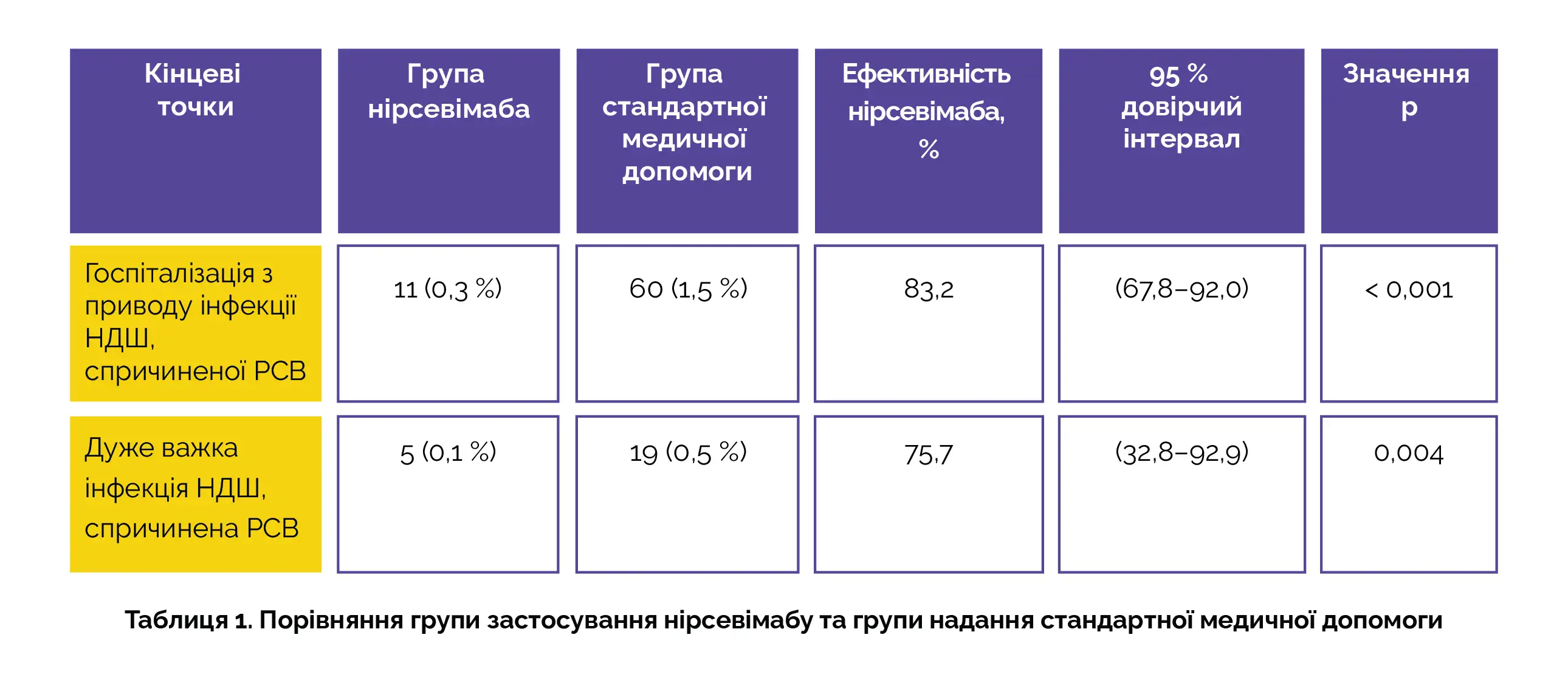 Основною кінцевою точкою дослідження була госпіталізація з приводу інфекції НДШ, викликаної РСВ, яка визначається як надходження до стаціонару та отримання позитивного результату аналізу, що вказує на наявність РСВ-інфекції. Додатковою кінцевою точкою був розвиток гострої інфекції НДШ, спричиненої РСВ, яка потребувала госпіталізації, із сатурацією кисню <90 % та потребою в оксигенотерапії. Дані про ефективність застосування нірсевімабу наведені нижче (див. таблицю 1).