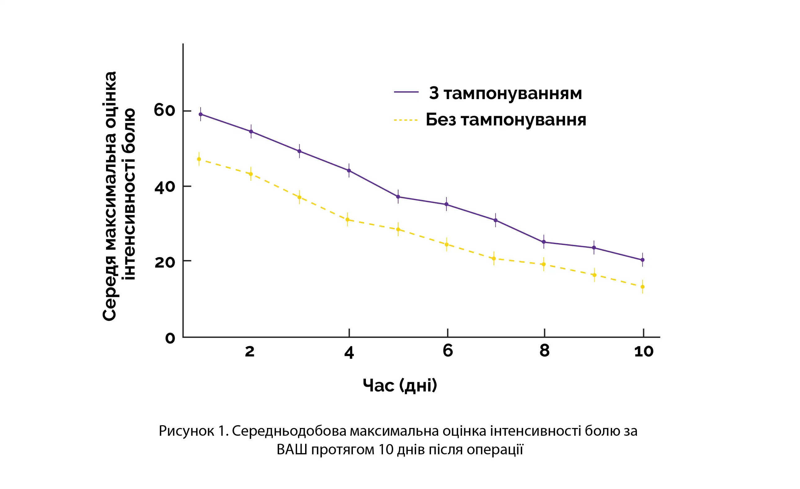 У 213 пацієнтів, рандомізованих до групи тампонування, інтенсивність болю була вищою, ніж у 220 пацієнтів, рандомізованих до групи відсутності тампонування (38,2 порівняно з 28,2 мм, середня різниця 9,9 мм) (див. рисунок 1).