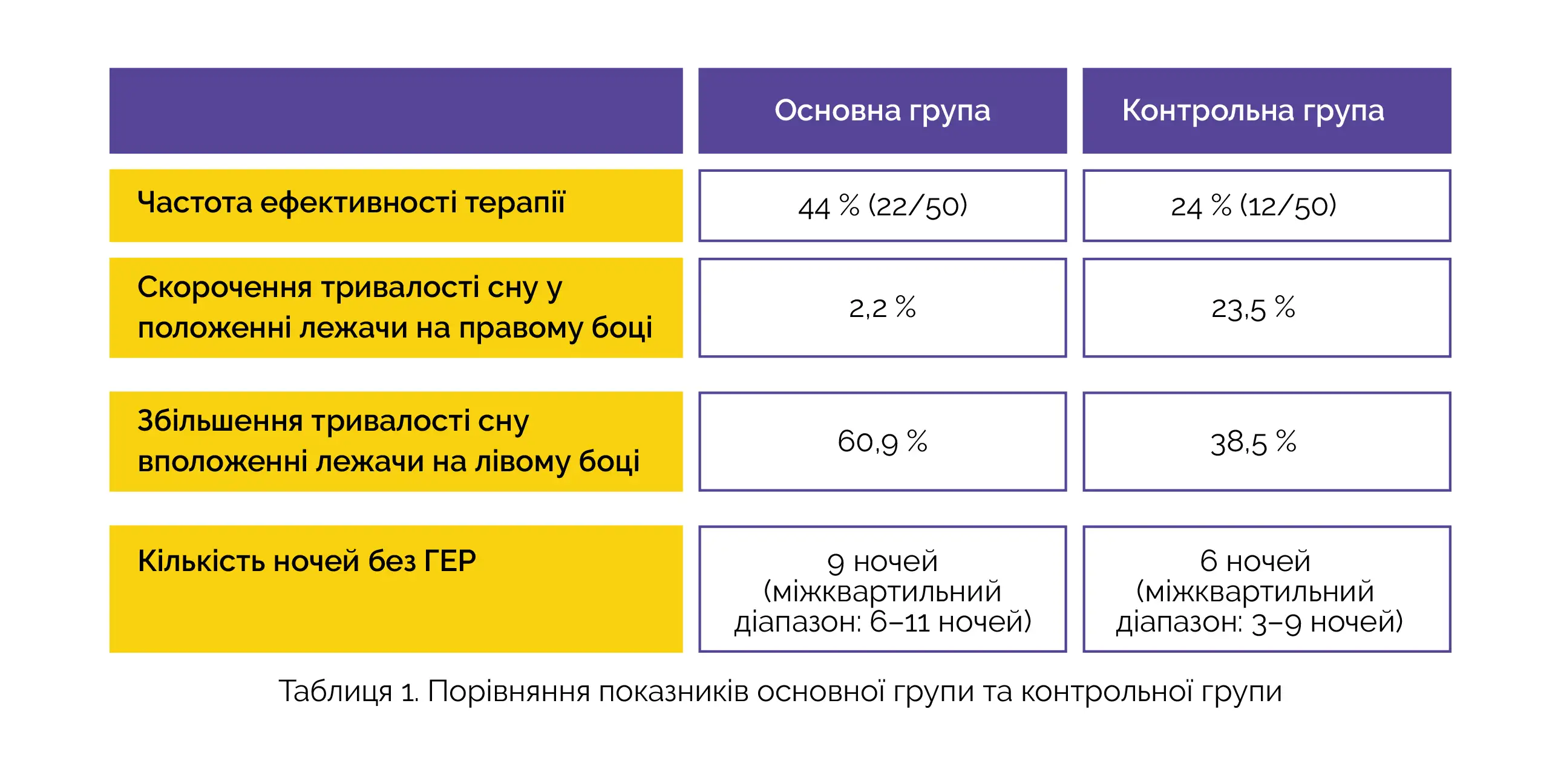 Відповідно до результатів аналізу даних залежно від призначеного втручання частота ефективності терапії була вищою в основній групі порівняно з контрольною групою (відмінність ризиків склала 20%). Терапія призводила до статистично значущого скорочення тривалості сну в положенні лежачи на правому боці та збільшення тривалості сну в положенні лежачи на лівому боці. У пацієнтів в основній групі відзначалося статистично значуще більше ночей без ГЕР порівняно з контрольною групою.