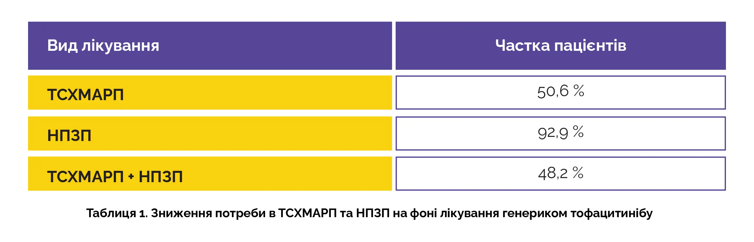 Серед пацієнтів, які отримували генерики тофацитинібу, 72% одночасно приймали ТСХМАРП (метотрексат/сульфасалазин/обидва препарати), а 53,6% також отримували НПЗП. Несподіваним став той факт, що генерики тофацитинібу дозволили значно знизити потребу у додаткових препаратах, як показано в Таблиці 1: