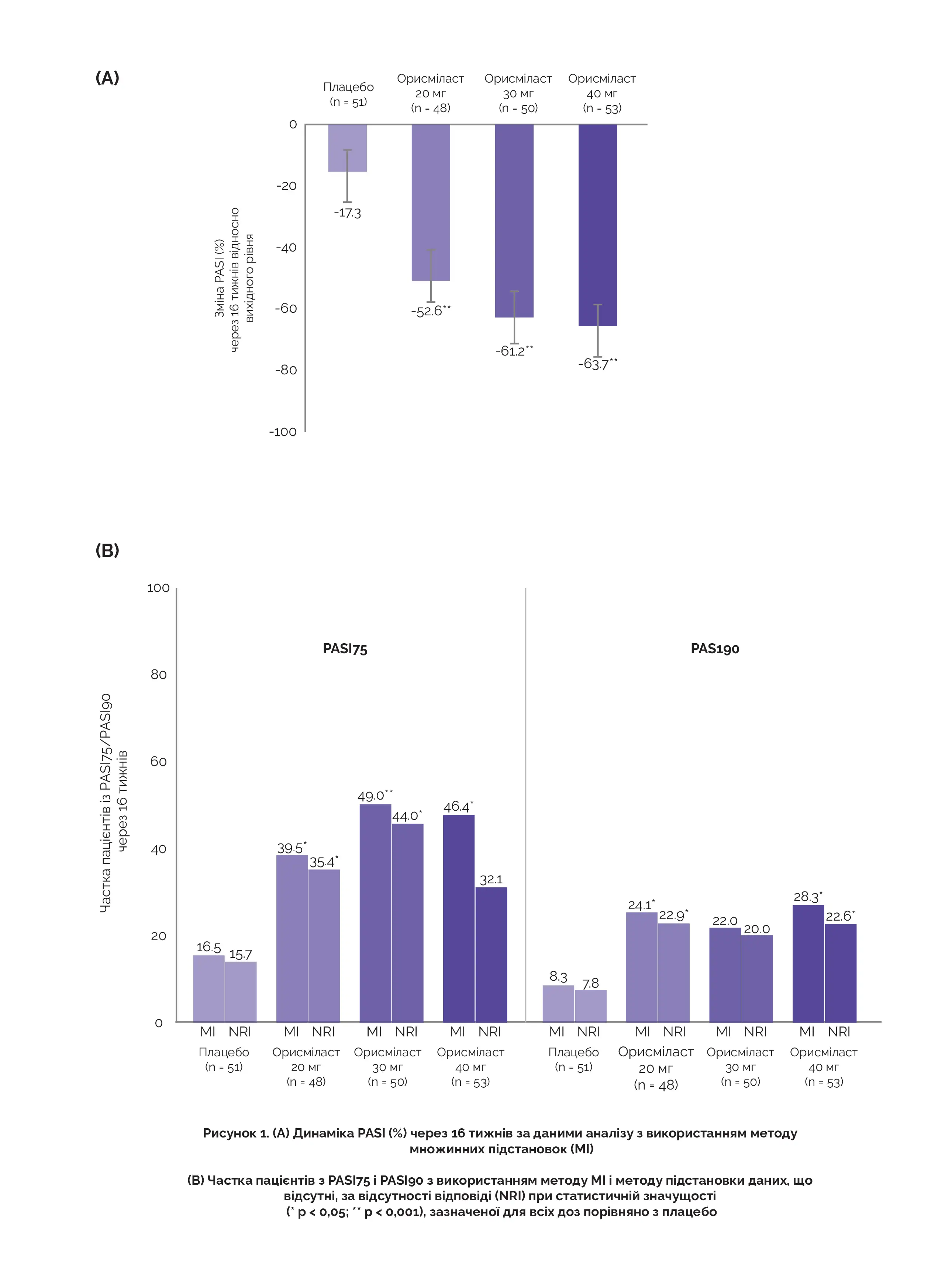 При застосуванні орисміласту спостерігалося значне покращення основного показника, відсоткової зміни PASI через 16 тижнів відносно вихідного рівня (орисміласт: з -52,6 % до -63,7 %, плацебо: -17,3 %). У групі орисміласту через 16 тижнів зареєстровано більше пацієнтів із PASI75 (39,5–49,0 %) та PASI90 (22,0–28,3 %; у дозі 20 та 40 мг) порівняно з плацебо (PASI75: 16,5 %, PASI90: 8,3 %) (див. рисунок 1).