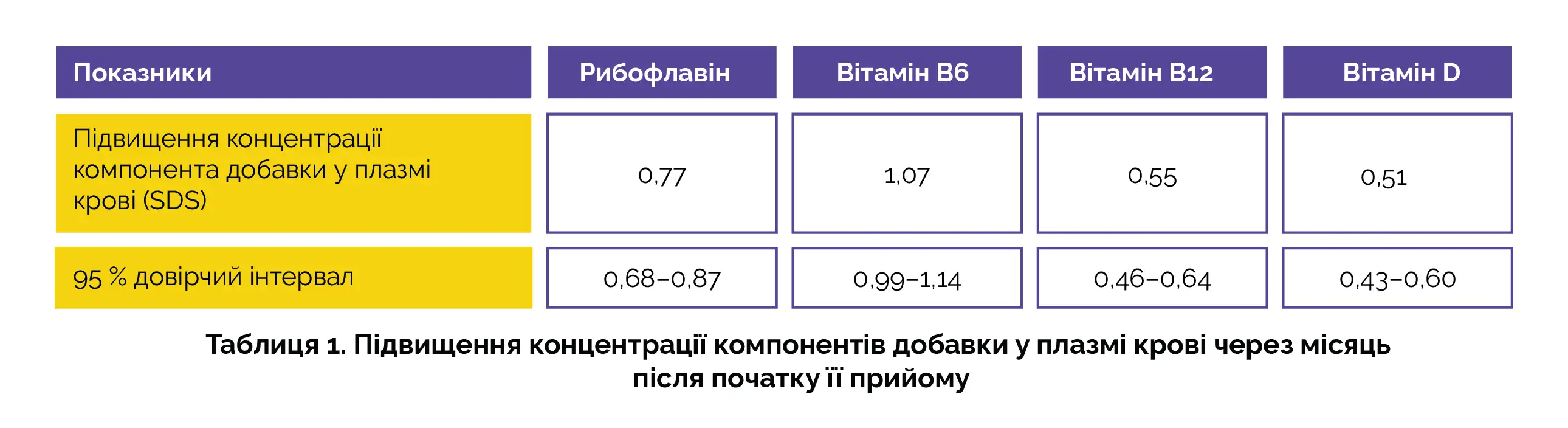 Концентрація вітамінів B6 і B12 у плазмі крові під час вагітності стабільно знижувалася, досягаючи значень, більш ніж на 1 SDS нижче за вихідні до 28-го тижня вагітності. У 54,2% учасниць у контрольній групі було зареєстровано низьку концентрацію вітаміну B6 (<20 нмоль/л) на пізніх термінах вагітності. Через один місяць прийому добавки у учасниць групи втручання були виявлені статистично значуще вищі концентрації компонентів добавки в плазмі крові порівняно з контрольною групою (див. таблицю 1).