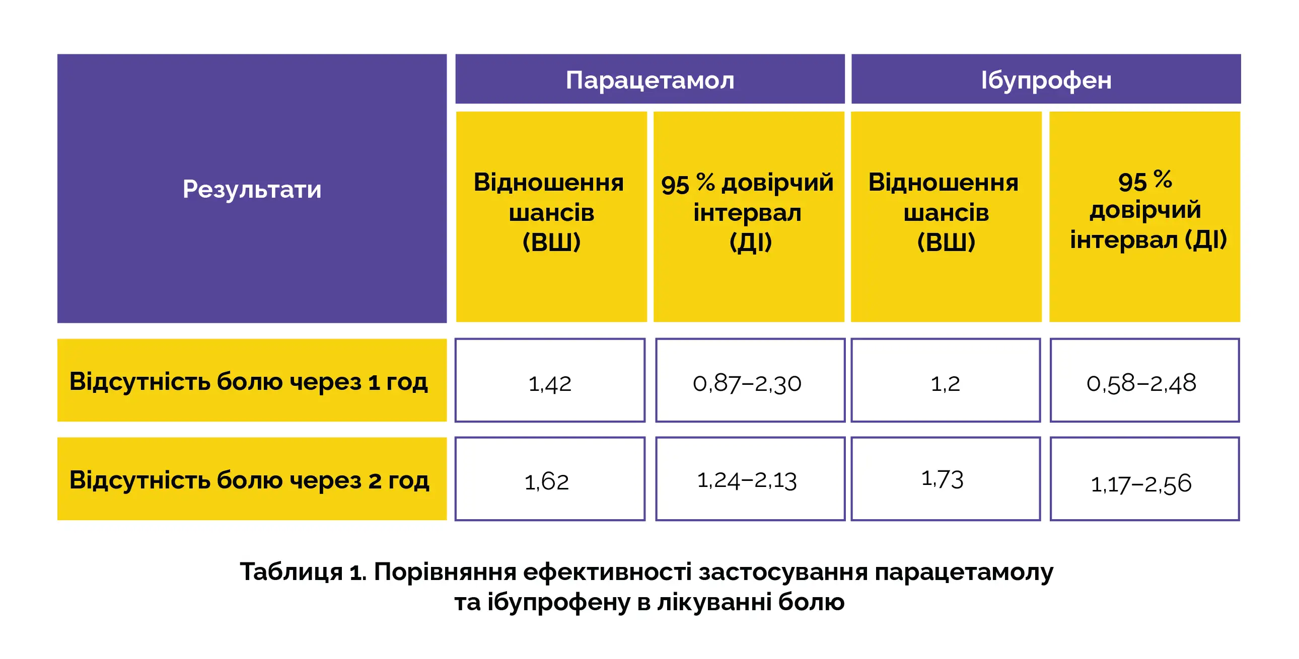 Ризик систематичної помилки оцінювали за допомогою інструменту Кокрейнівської співпраці. В жодному з досліджень не було виявлено низького ризику систематичної помилки в жодній з областей, що насамперед було пов'язано з недостатнім обсягом звітності та обмеженим розміром вибірки. У порівнянні з парацетамолом ібупрофен ефективніше полегшував біль через 2 години, при цьому парацетамол перевершував ібупрофен щодо усунення болю через 1 годину (див. таблицю 1).