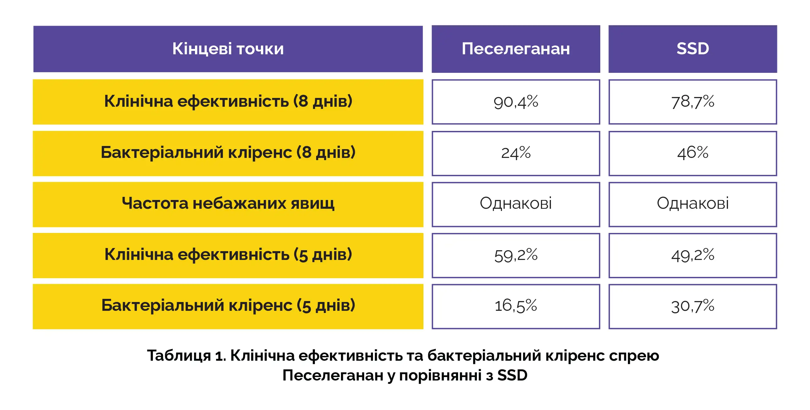 Загалом 558 пацієнтів завершили дослідження. Після 8 днів терапії спреєм Песелеганан клінічна ефективність була вищою, ніж при терапії SSD, але з нижчим бактеріальним кліренсом. Частота небажаних явищ при застосуванні обох препаратів була аналогічною. Через 5 днів застосування спрею Песелеганан також спостерігалася найкраща клінічна ефективність порівняно з SSD, хоча бактеріальний кліренс був нижчим.