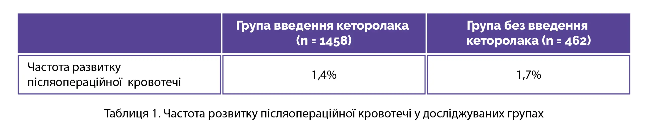 За наявними повідомленнями частота розвитку післяопераційних кровотеч при тонзилектомії становить 1,5%. При цьому статистично значущих відмінностей між групами пацієнтів, які отримували та не отримували кеторолак, щодо частоти розвитку післяопераційної кровотечі при тонзилектомії виявлено не було (див. таблицю 1).