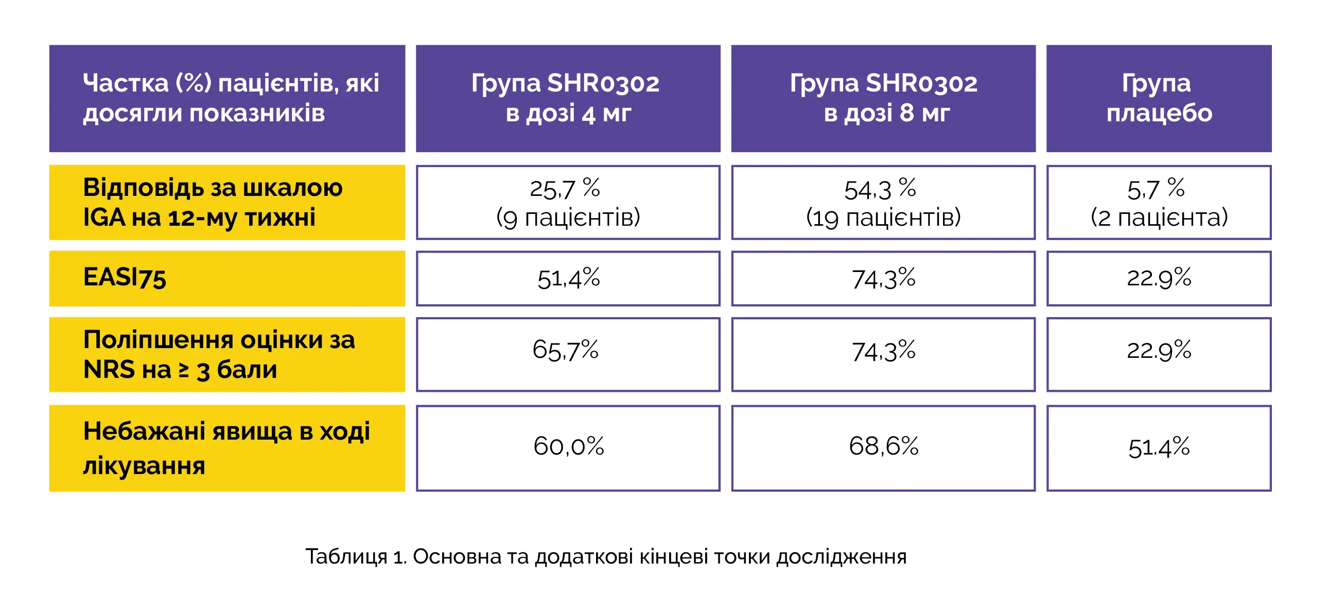 Препарат SHR0302 у дозах 8 мг та 4 мг був більш ефективним, ніж плацебо, при цьому ефективність у групі застосування препарату у дозі 8 мг виявилася вищою, ніж у групі застосування препарату у дозі 4 мг. У більшості випадків небажані явища, що спостерігалися, були легкого ступеня тяжкості. Зокрема, повідомлялося про три важкі небажані явища, всі з яких були пов'язані з погіршенням перебігу атопічного дерматиту. Серйозних інфекцій не спостерігалося. Таким чином, препарат SHR0302 для прийому всередину (в дозі 4 мг і 8 мг) чинить сприятливу дію на стан здоров'я пацієнтів з атопічним дерматитом.
