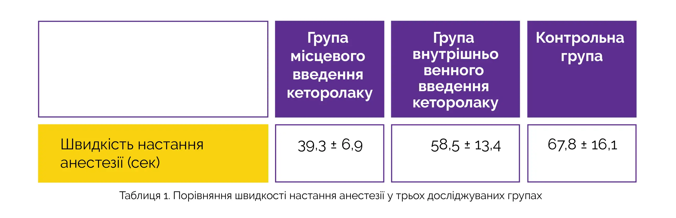 У порівнянні з групою внутрішньовенного введення кеторолаку, у пацієнтів з групи місцевого введення кеторолаку анестезія наставала статистично значно швидше, при цьому в обох цих групах анестезія наставала статистично значно швидше, ніж у контрольній групі (див. таблицю 1).