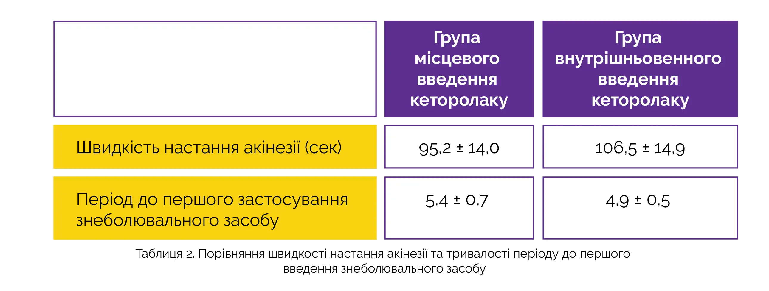 У порівнянні з групою внутрішньовенного введення кеторолаку, у пацієнтів з групи місцевого введення кеторолаку акінезія наставала статистично значно швидше, при цьому період до першого застосування знеболювального засобу був статистично значуще довшим (див. таблицю 2).