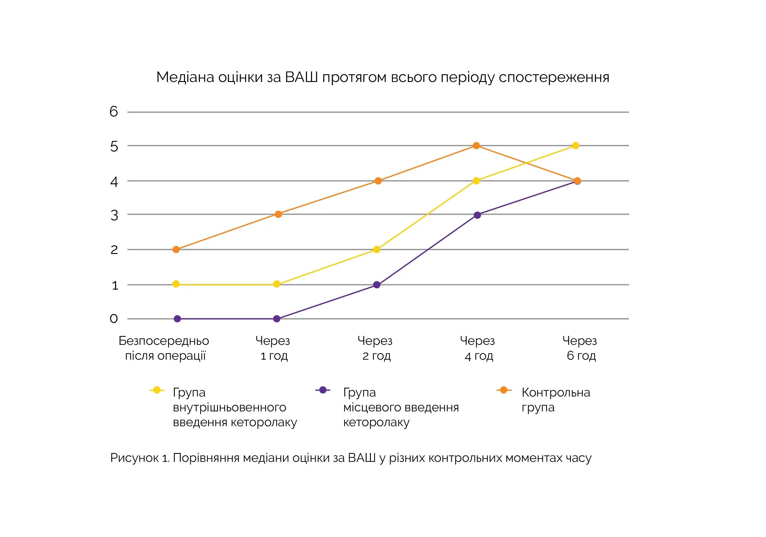 Порівняно з групою внутрішньовенного введення кеторолаку та контрольною групою, у пацієнтів з групи місцевого введення кеторолаку тривалість блокади була статистично значуще довшою. Наявність статистично значущих відмінностей медіани оцінки за ВАШ вказувала на те, що в групі місцевого введення кеторолаку інтенсивність болю була меншою, ніж у групі внутрішньовенного введення кеторолаку (див. рис. 1).