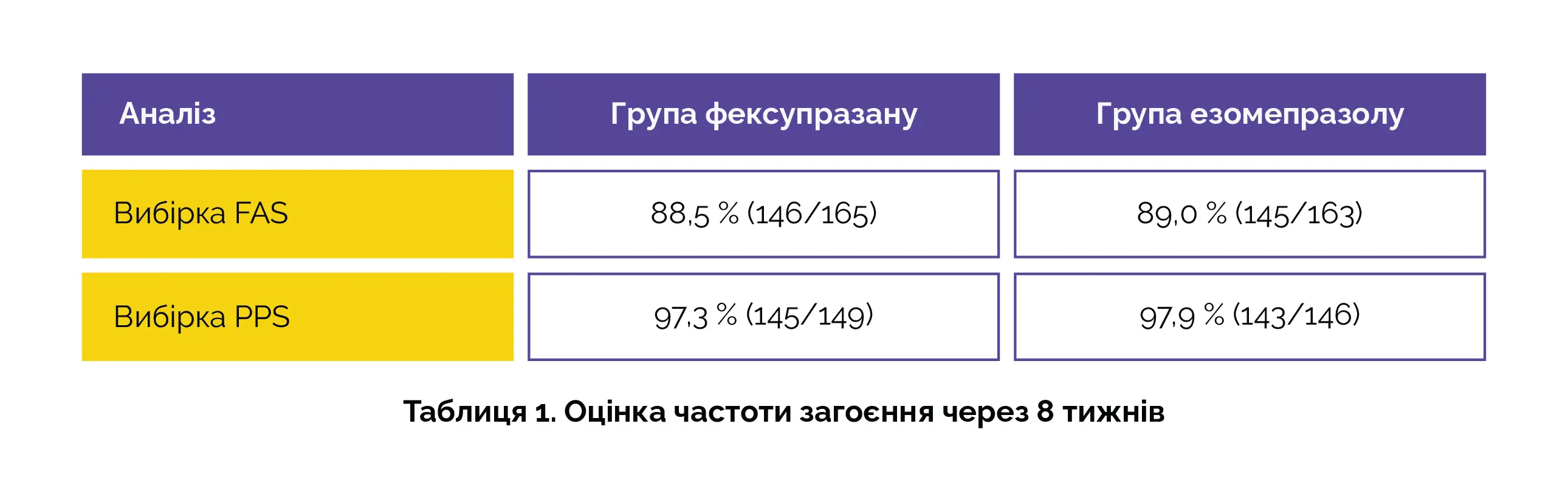 Обидва препарати забезпечували високі показники загоєння ерозивного езофагіту. Фексупразан не поступався езомепразолу за частотою загоєння ерозивного езофагіту через 8 тижнів як при аналізі вибірки FAS, так і при аналізі вибірки PPS (див. таблицю 1).