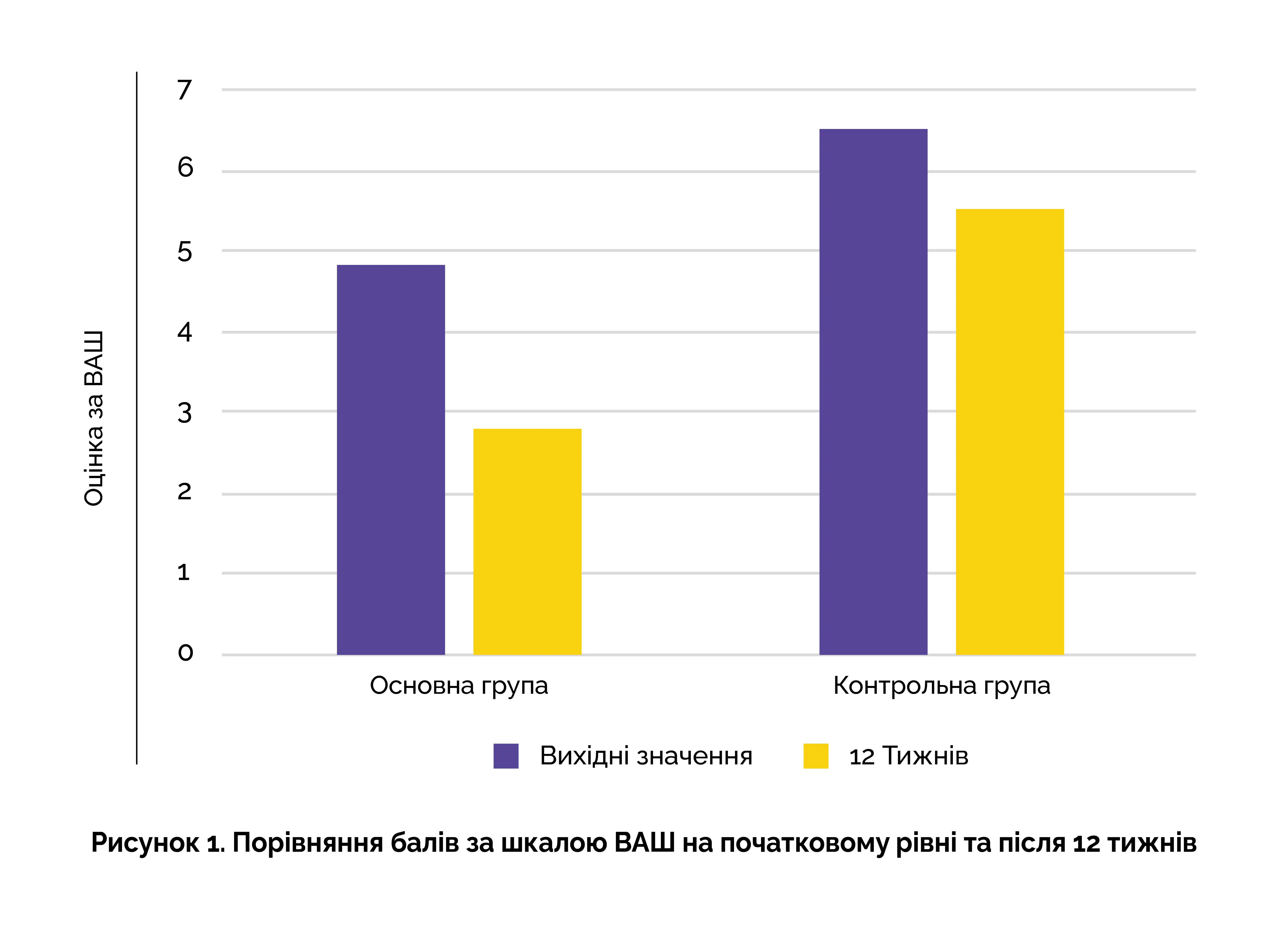 Дослідник оцінював максимальне відкриття та бічну екскурсію (ліву та праву) нижньої щелепи та бали за візуальною аналоговою шкалою (ВАШ) у сліпому режимі. Оцінку проводили в 4 різних часових точках: Т0 (базовий рівень), Т1 (2 тижні після Т0), Т2 (6 тижнів після Т0) і Т3 (12 тижнів після Т0). Результати оцінки всіх результатів показали стійке поліпшення в обох групах, з більш вираженим зниженням балів за шкалою ВАШ в досліджуваній групі (см. рисунок 1).