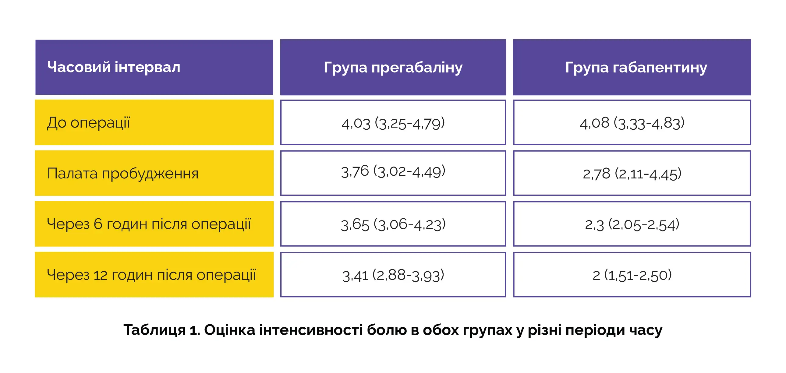 Обидва препарати забезпечували зниження інтенсивності болю з часом. Однак ефективність знеболювання у групі застосування прегабаліну була вищою порівняно з групою застосування габапентину. У таблиці 1 представлені середні показники оцінки інтенсивності болю з 95% довірчим інтервалом (ДІ) для 4 часових інтервалів.