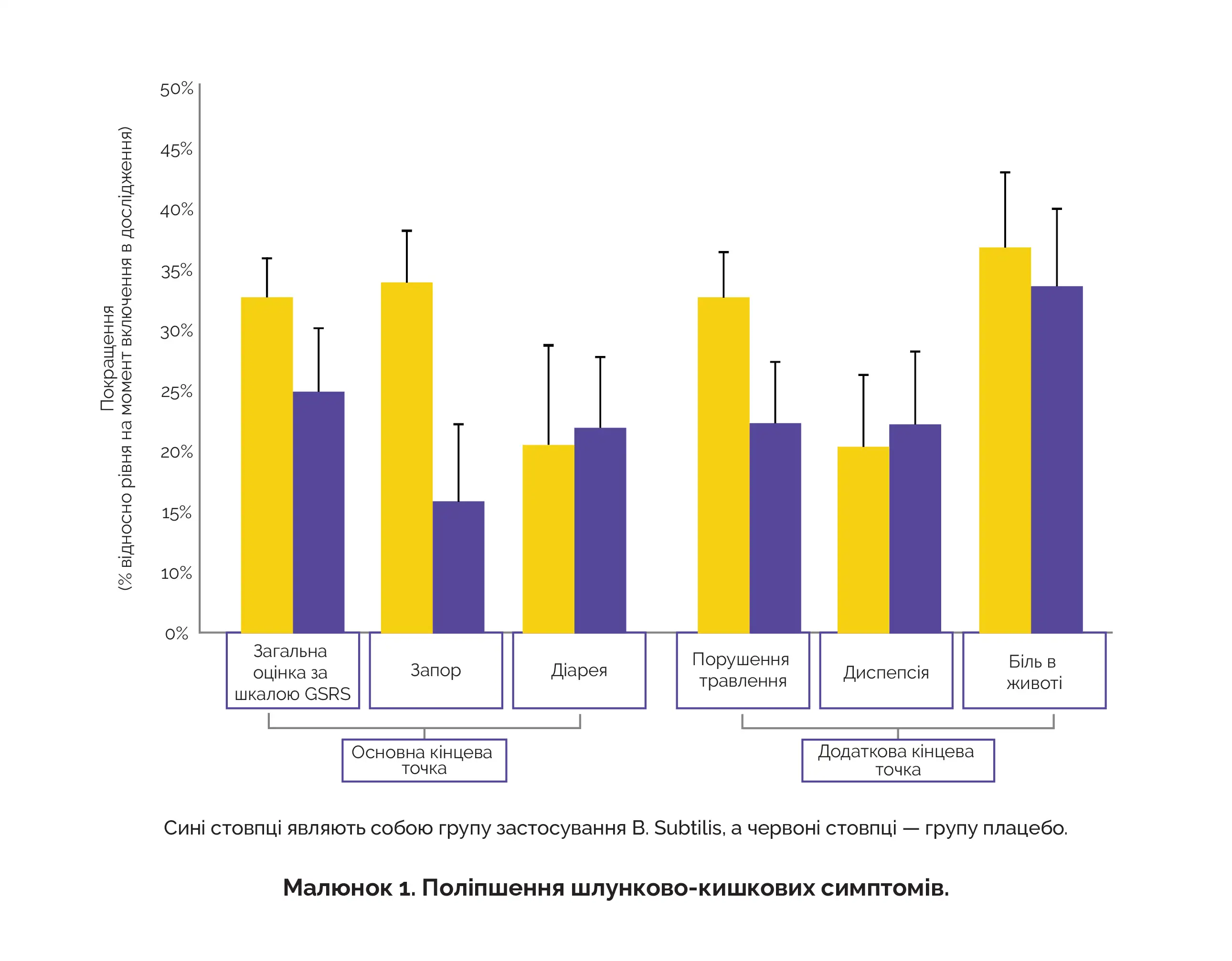 У групі втручання було зареєстровано поліпшення щодо таких показників, як диспепсія (на 10%), порушення травлення (на 11%) та запор (на 18%) порівняно з плацебо (див. рис. 1).
