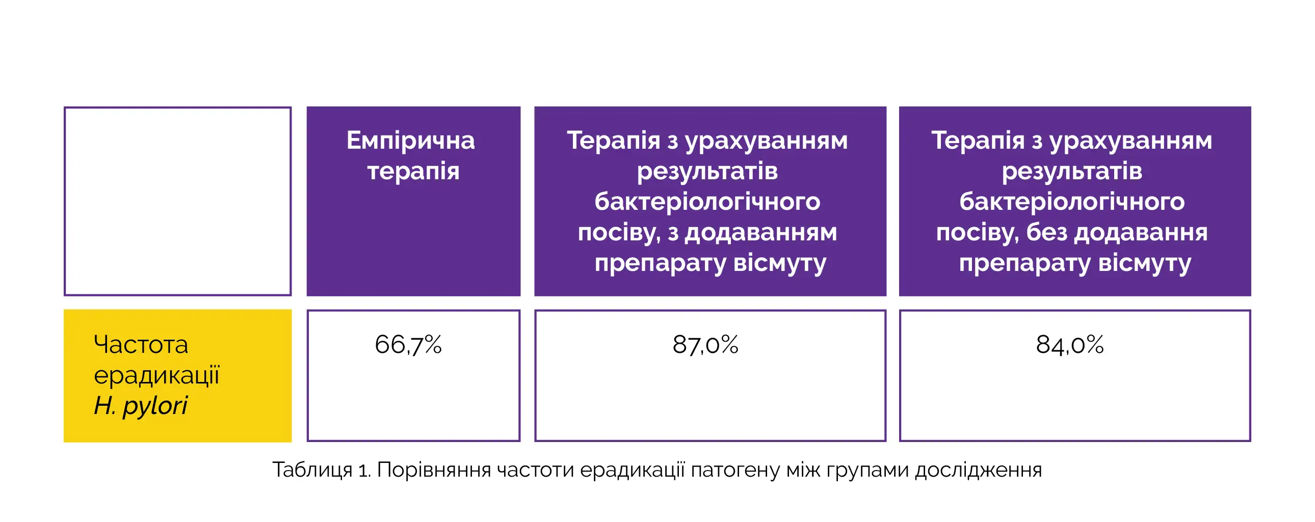 Оцінку результатів лікування проводили на 8-му тижні. Загалом у дослідженні взяли участь 126 пацієнтів. Дані про частоту ерадикації патогену при емпіричній терапії (n = 30), терапії, що призначається з урахуванням результатів бактеріологічного посіву, з додаванням препарату вісмуту (n = 46) та терапії, що призначається з урахуванням результатів бактеріологічного посіву, без додавання препарату вісмуту (n = 5) наведені у таблиці 1