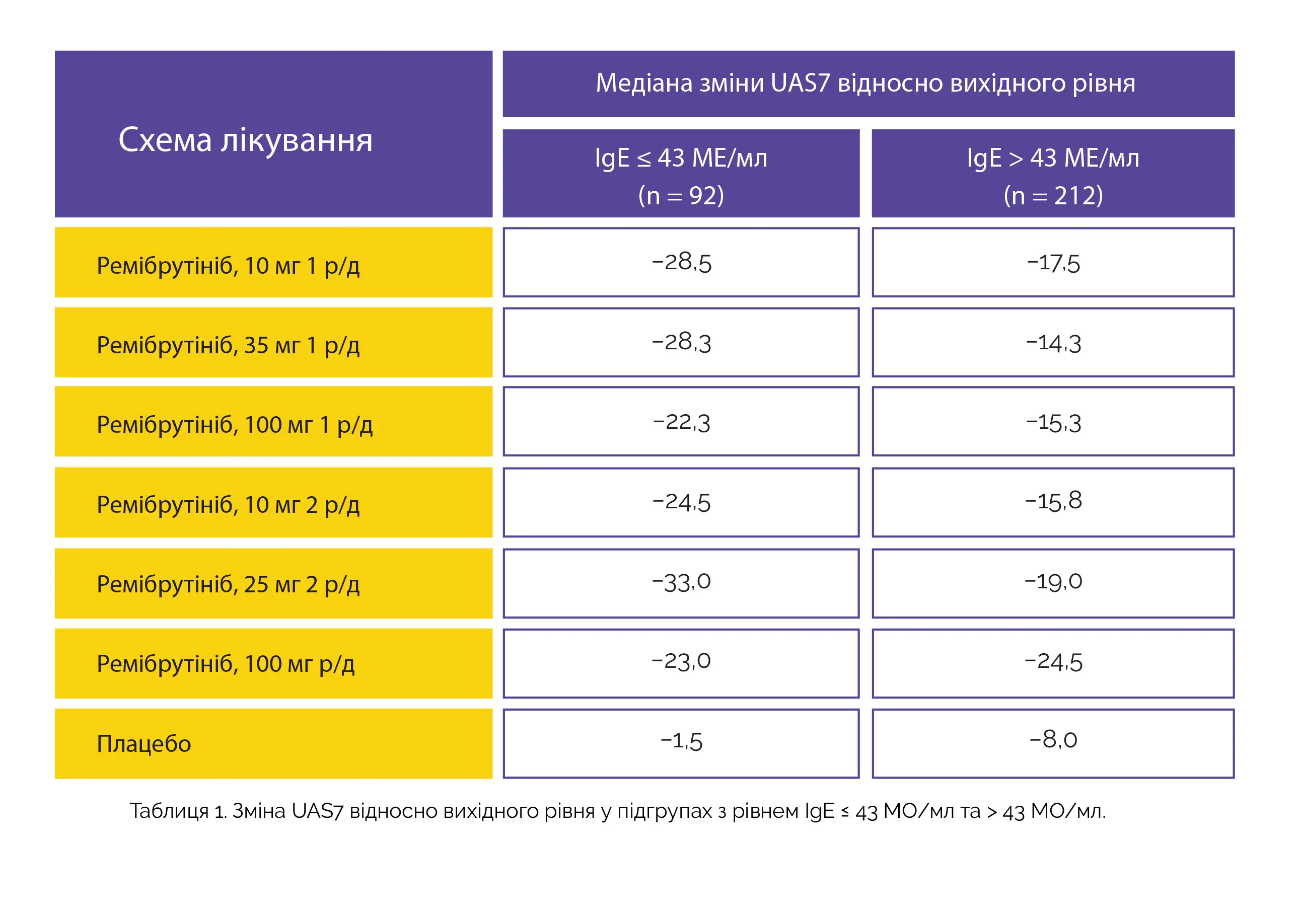Крім того, у підгрупі з рівнем IgE ≤ 43 МО/мл частка пацієнтів з UAS7 = 0 та UAS7 ≤ 6 була вищою незалежно від величини дози ремібрутінібу. Результати зазначеного аналізу у підгрупах свідчать про здатність ремібрутінібу знижувати виразність ознак та симптомів ХСК у пацієнтів із вихідним рівнем IgE ≤ 43 МО/мл.