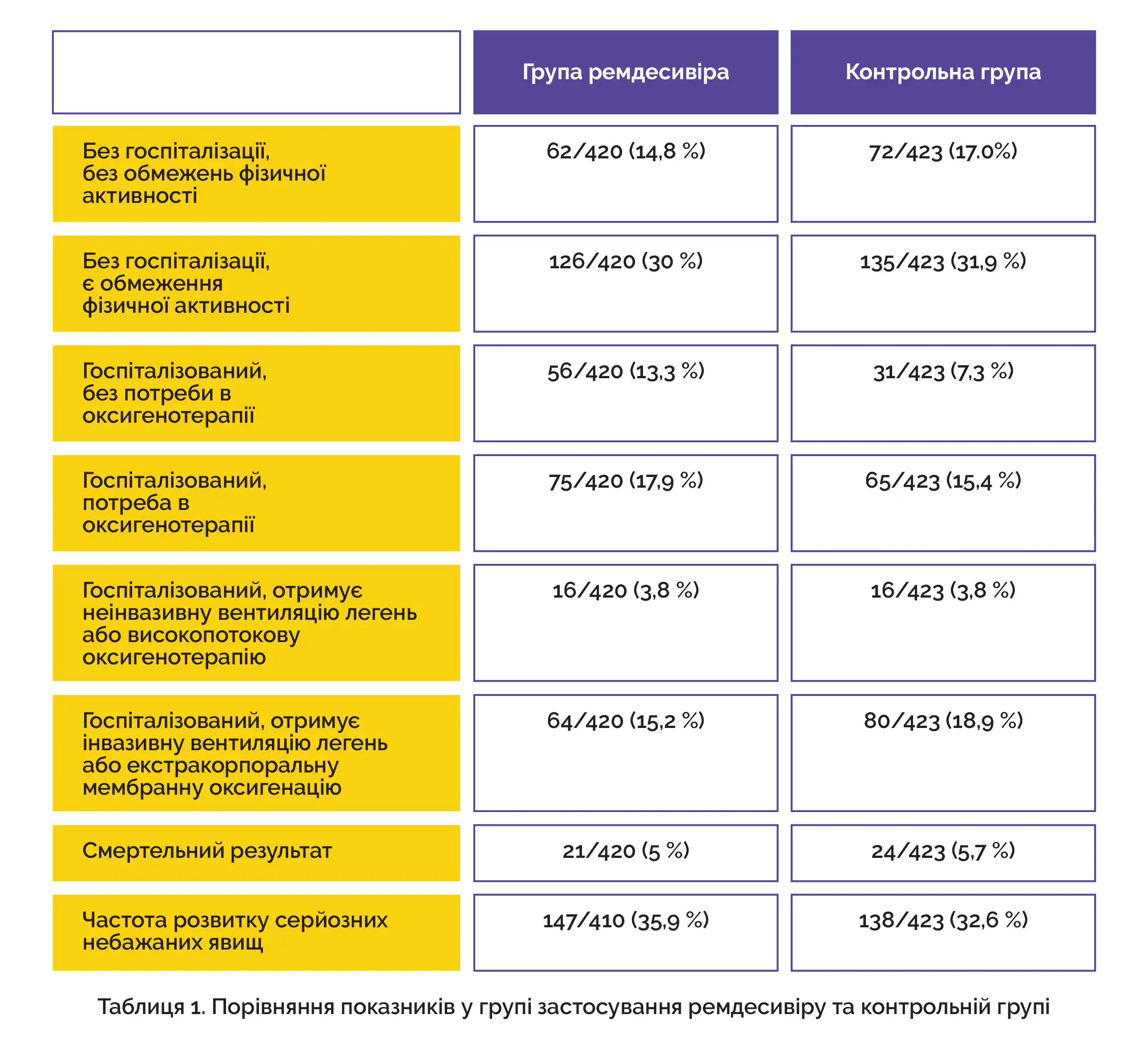Дані про розподіл оцінок за порядковою шкалою ВООЗ на 15-й день у групах дослідження наведено у таблиці 1.