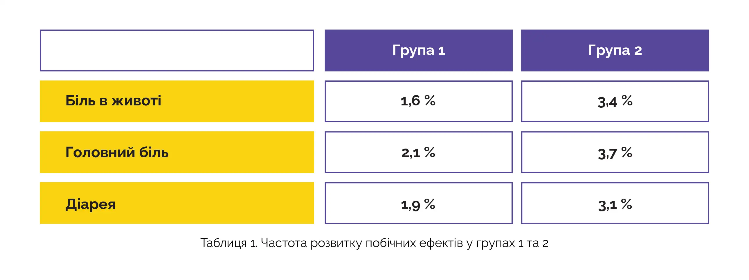У рамках дослідження 118 пацієнтів (відповідних критеріям включення) були послідовно розподілені у 2 групи: 58 пацієнтів у групу 1 та 60 пацієнтів у групу 2. У групі 1 частота одужання склала 89,5 % через 4 тижні, а у групі 2 – 91,2% через 8 тижнів. Статистично значущих відмінностей між групами виявлено не було. Огляд побічних ефектів, зареєстрованих в обох групах (низька частота розвитку побічних ефектів групи 1), наведено нижче.