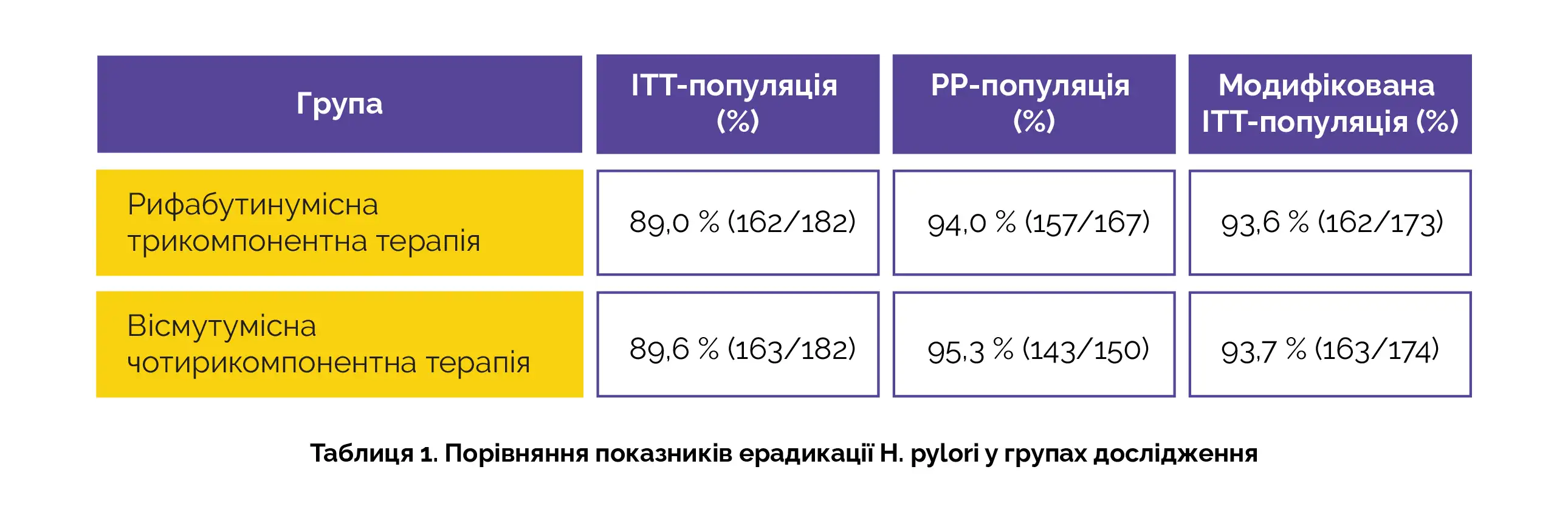 У ході дослідження оцінювали чутливість бактерій до цих протимікробних препаратів з використанням методів розведення в агарі та Е-тесту. Частота ерадикації H. pylori у групах, визначена за допомогою аналізу модифікованої вибірки за призначеним лікуванням (mITT), вибірки без відхилень від протоколу (PP) і вибірки за призначеним лікуванням (ITT), представлена в таблиці.