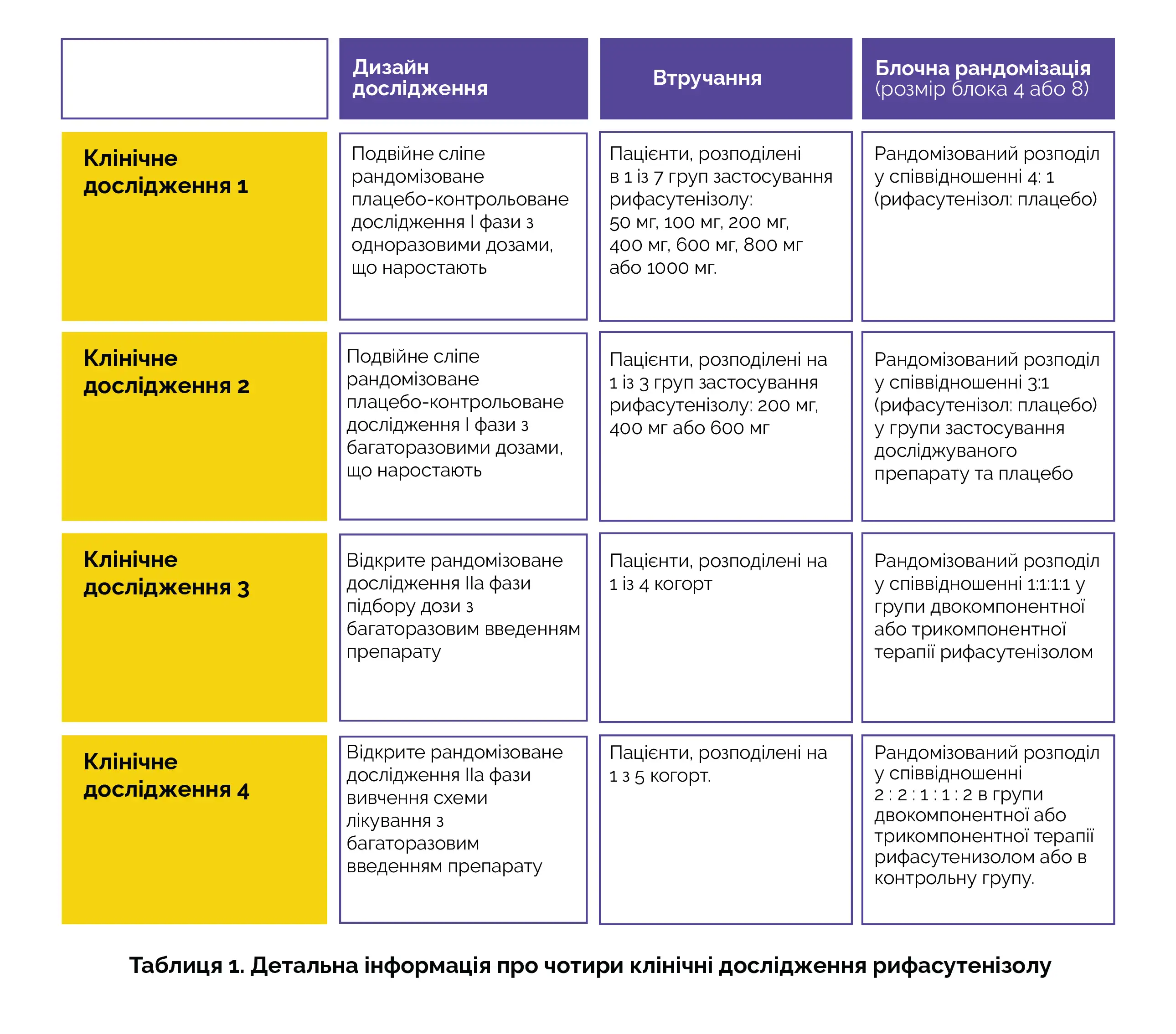 Основу даного дослідження склали 4 клінічні дослідження (див. таблицю 1) рифасутенізолу у формі капсул у здорових добровольців та пацієнтів з безсимптомною інфекцією, викликаною H. pylori (у віці від 18 до 65 років), проведених у Китаї.