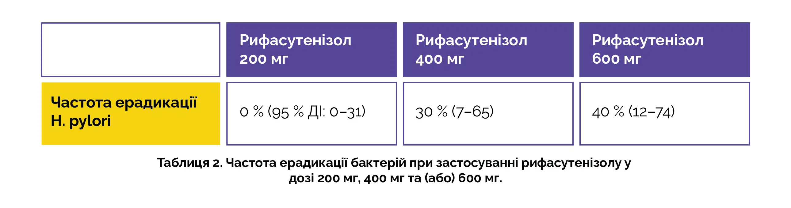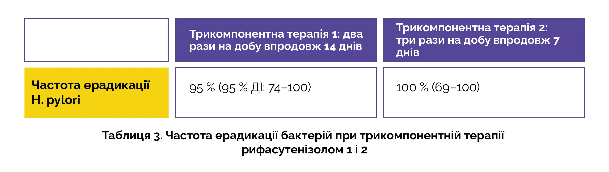 Частота ерадикації H. pylori при застосуванні рифасутенізолу в дозі 400 мг у поєднанні з рабепразолом натрію в дозі 20 мг та амоксициліном у дозі 1 г (трикомпонентна терапія 1) двічі на добу протягом 14 днів та при застосуванні рифасутенізолу з рабепразолом натрію в дозі 20 мг + амоксициліном у дозі 1 г (трикомпонентна терапія 2) тричі на добу протягом тижня у дослідженні 4 вказано нижче (таблиця 3).