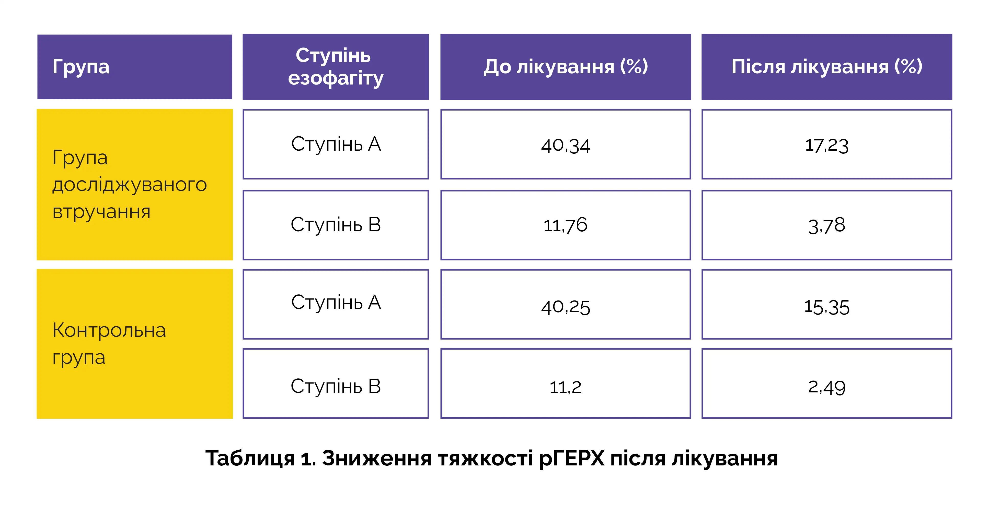 У групі досліджуваного лікування загальна клінічна ефективність лікування симптомів була вищою, а загальні оцінки симптомів були нижчими, ніж у контрольній групі. Крім того, у учасників групи досліджуваного лікування зниження оцінок основних симптомів рГЕРХ, включаючи печію, біль за грудиною, регургітацію, відрижку та відрижку кислим, було більш вираженим, ніж у контрольній групі. У групі досліджуваного лікування (Z = 8,169) та контрольній групі (Z = 9,800) спостерігалося значне зниження ступеня запалення стравоходу, що свідчить про порівнянну ефективність (див. таблицю 1).
